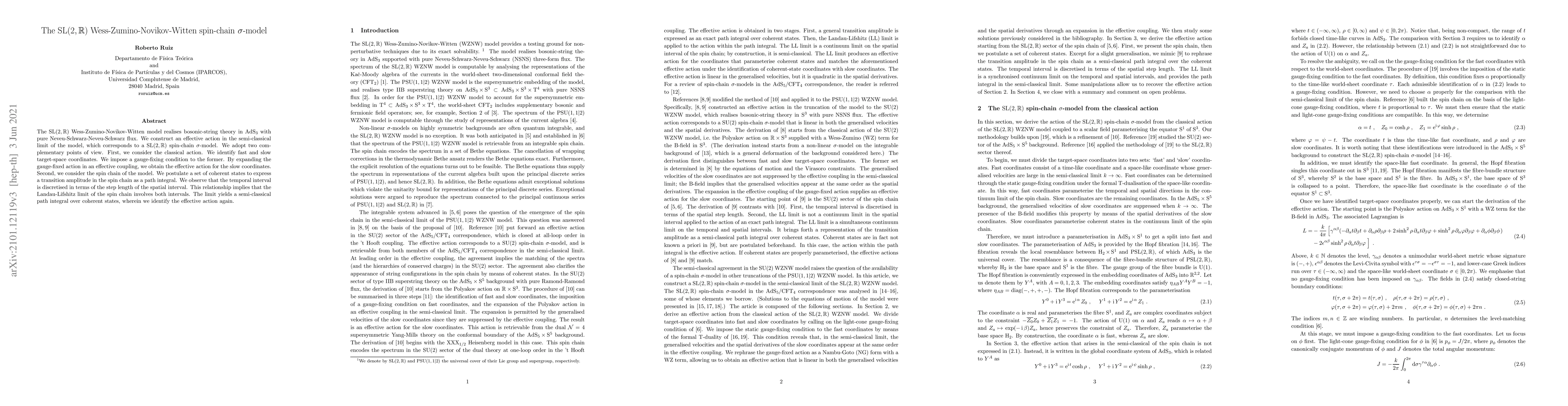 This paper constructs an effective action for the $\mathrm{SL}(2,\mathbb{R})$ Wess-Zumino-Novikov-Witten model in the semi-classical limit, revealing it as an $\mathrm{SL}(2,\mathbb{R})$ spin-chain $\sigma$-model. The authors derive the effective action through classical and spin-chain perspectives, showing a relationship between the temporal and spatial intervals in the model.