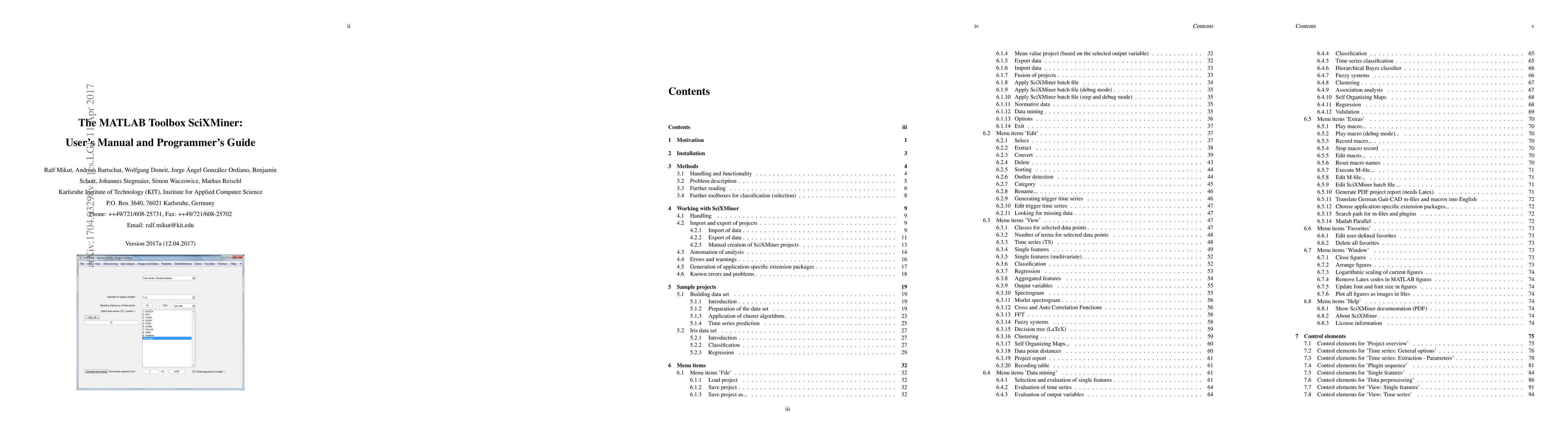 The Matlab toolbox SciXMiner is designed for the visualization and analysis of time series and features with a special focus to classification problems. It was developed at the Institute of Applied Computer Science of the Karlsruhe Institute of Technology (KIT), a member of the Helmholtz Association of German Research Centres in Germany. The aim was to provide an open platform for the development and improvement of data mining methods and its applications to various medical and technical problems. SciXMiner bases on Matlab (tested for the version 2017a). Many functions do not require additional standard toolboxes but some parts of Signal, Statistics and Wavelet toolboxes are used for special cases. The decision to a Matlab-based solution was made to use the wide mathematical functionality of this package provided by The Mathworks Inc. SciXMiner is controlled by a graphical user interface (GUI) with menu items and control elements like popup lists, checkboxes and edit elements. This makes it easier to work with SciXMiner for inexperienced users. Furthermore, an automatization and batch standardization of analyzes is possible using macros. The standard Matlab style using the command line is also available. SciXMiner is an open source software. The download page is http://sourceforge.net/projects/SciXMiner. It is licensed under the conditions of the GNU General Public License (GNU-GPL) of The Free Software Foundation.