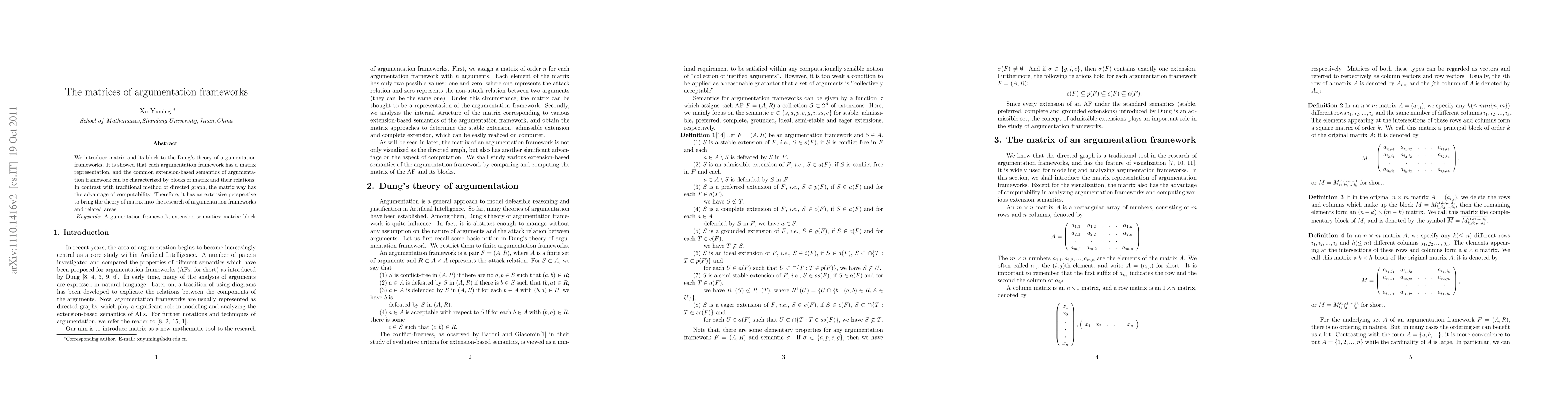 This paper introduces a matrix representation for Dung's argumentation frameworks, demonstrating that each framework can be characterized by matrix blocks. The approach offers a computationally advantageous alternative to traditional directed graph methods, potentially expanding the integration of matrix theory into argumentation research.