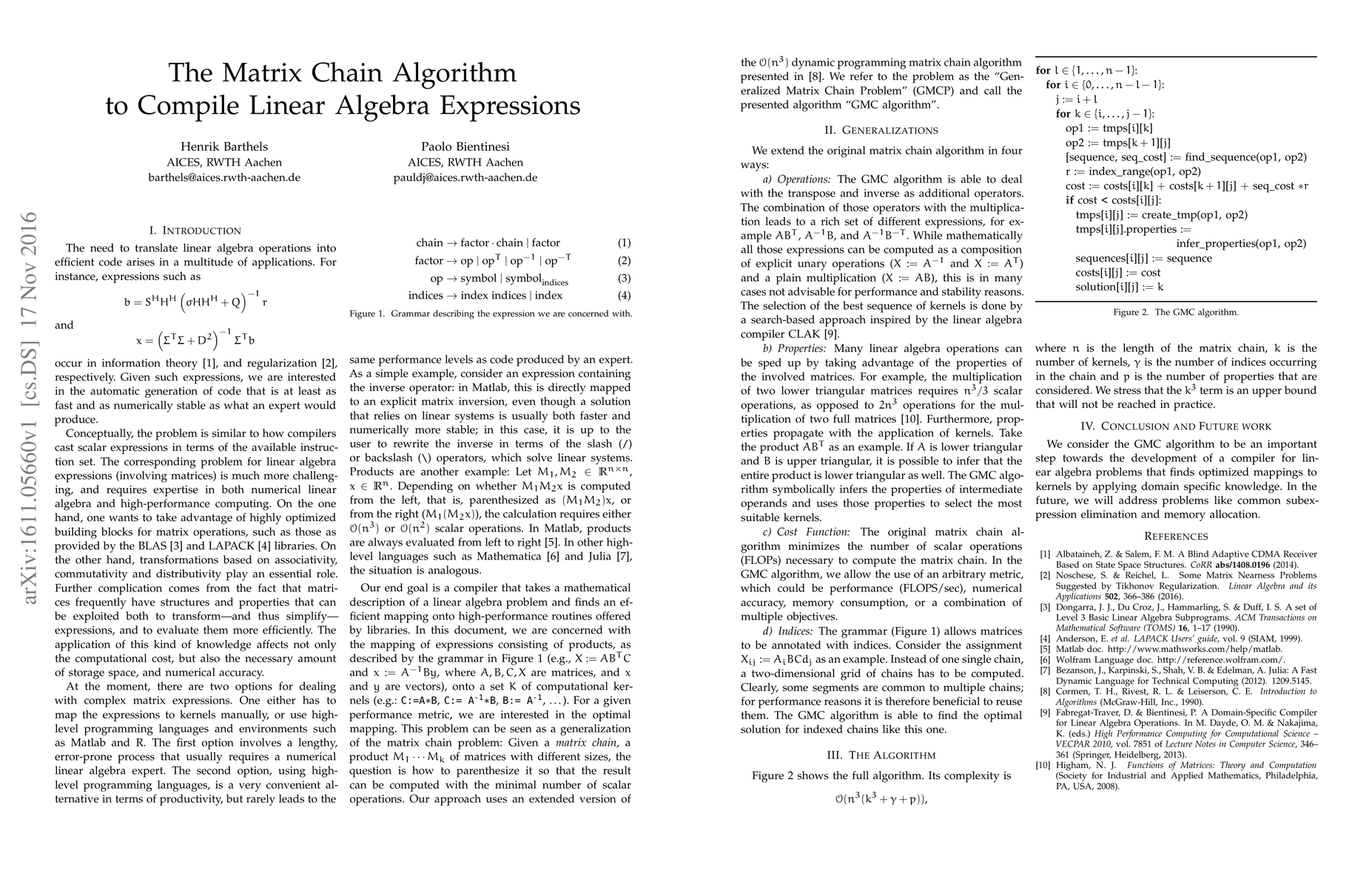 This paper introduces a generalization of the matrix chain problem to optimize mapping of linear algebra expressions to optimized kernels, aiming to relieve users from manual task mapping and develop new techniques for compilation.