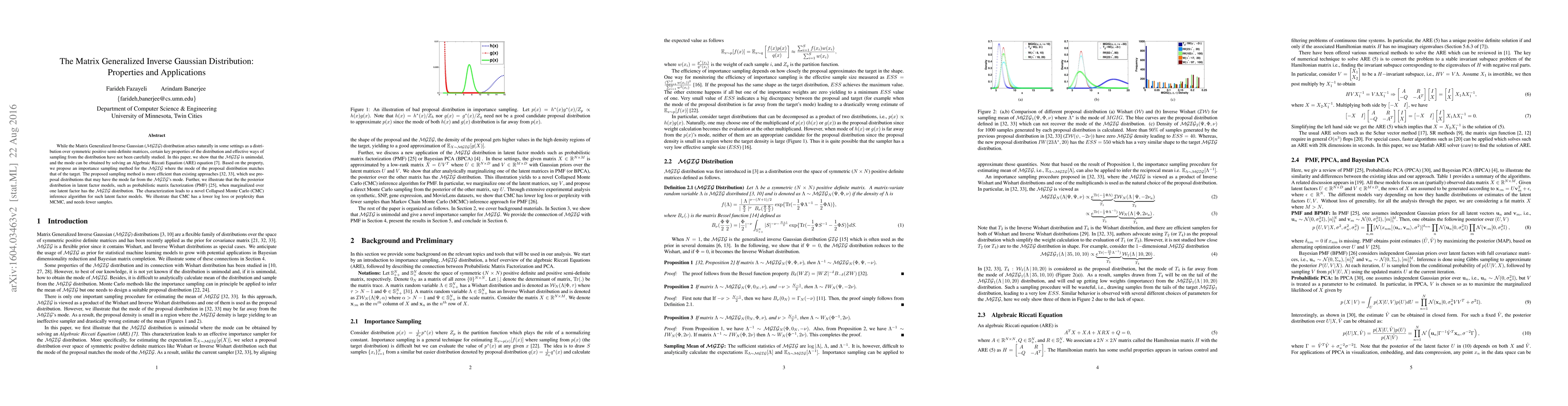 While the Matrix Generalized Inverse Gaussian ($\mathcal{MGIG}$) distribution arises naturally in some settings as a distribution over symmetric positive semi-definite matrices, certain key properties of the distribution and effective ways of sampling from the distribution have not been carefully studied. In this paper, we show that the $\mathcal{MGIG}$ is unimodal, and the mode can be obtained by solving an Algebraic Riccati Equation (ARE) equation [7]. Based on the property, we propose an importance sampling method for the $\mathcal{MGIG}$ where the mode of the proposal distribution matches that of the target. The proposed sampling method is more efficient than existing approaches [32, 33], which use proposal distributions that may have the mode far from the $\mathcal{MGIG}$'s mode. Further, we illustrate that the the posterior distribution in latent factor models, such as probabilistic matrix factorization (PMF) [25], when marginalized over one latent factor has the $\mathcal{MGIG}$ distribution. The characterization leads to a novel Collapsed Monte Carlo (CMC) inference algorithm for such latent factor models. We illustrate that CMC has a lower log loss or perplexity than MCMC, and needs fewer samples.