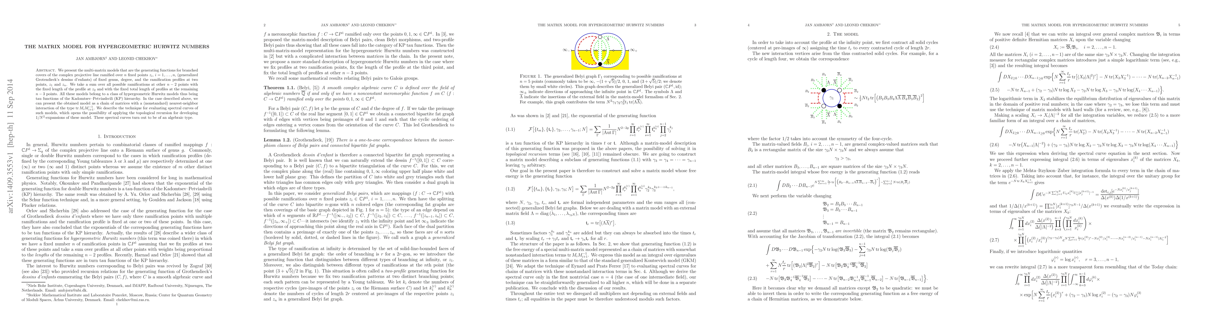 We present the multi-matrix models that are the generating functions for branched covers of the complex projective line ramified over $n$ fixed points $z_i$, $i=1,\dots,n$, (generalized Grotendieck's dessins d'enfants) of fixed genus, degree, and the ramification profiles at two points, $z_1$ and $z_n$. We take a sum over all possible ramifications at other $n-2$ points with the fixed length of the profile at $z_2$ and with the fixed total length of profiles at the remaining $n-3$ points. All these models belong to a class of hypergeometric Hurwitz models thus being tau functions of the Kadomtsev--Petviashvili (KP) hierarchy. In the case described above, we can present the obtained model as a chain of matrices with a (nonstandard) nearest-neighbor interaction of the type $\tr M_iM_{i+1}^{-1}$. We describe the technique for evaluating spectral curves of such models, which opens the possibility of applying the topological recursion for developing $1/N^2$-expansions of these model. These spectral curves turn out to be of an algebraic type.