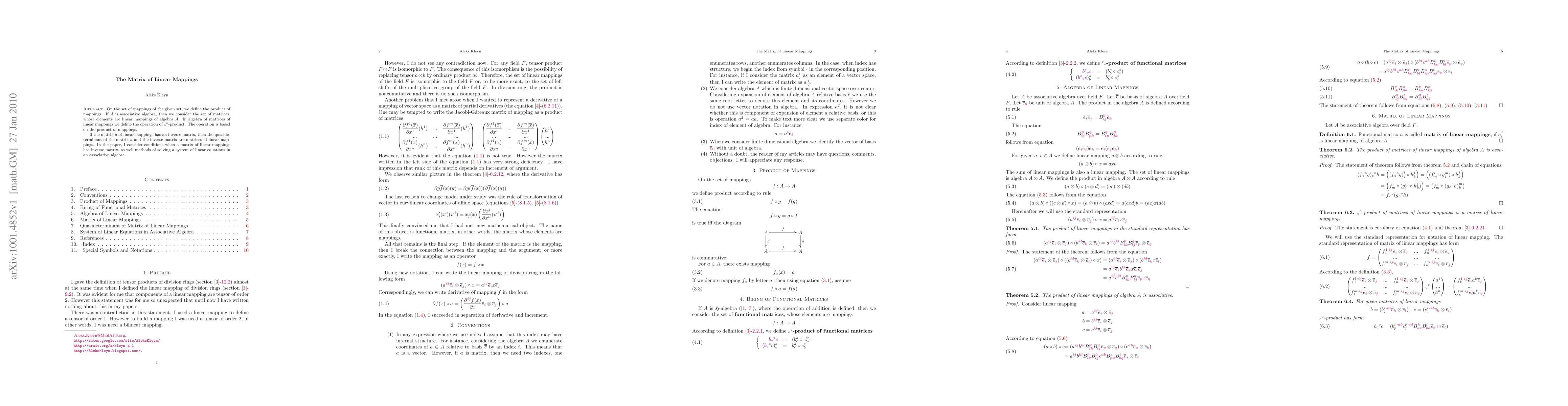 This paper explores the algebra of matrices composed of linear mappings within an associative algebra, defining matrix multiplication based on the product of mappings. It investigates conditions under which such matrices have inverses and discusses methods for solving linear equations in this context.