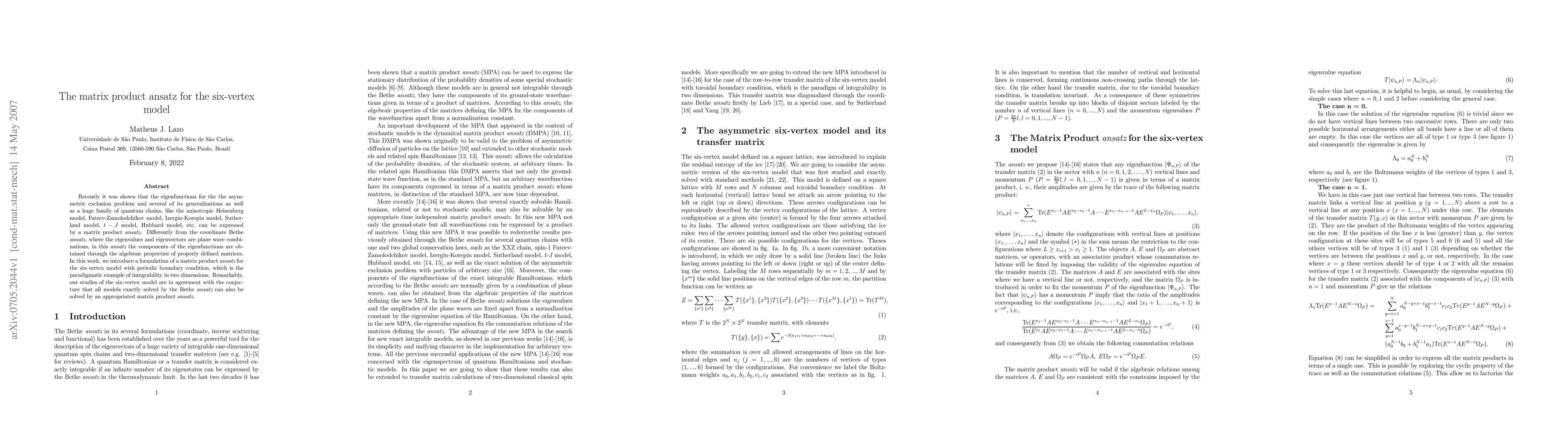 This paper introduces a matrix product ansatz for the six-vertex model, demonstrating its applicability to two-dimensional integrable systems. The proposed method aligns with the conjecture that models solvable by the Bethe ansatz can also be solved using matrix product ansatz, offering a new algebraic approach to eigenfunction representation.
