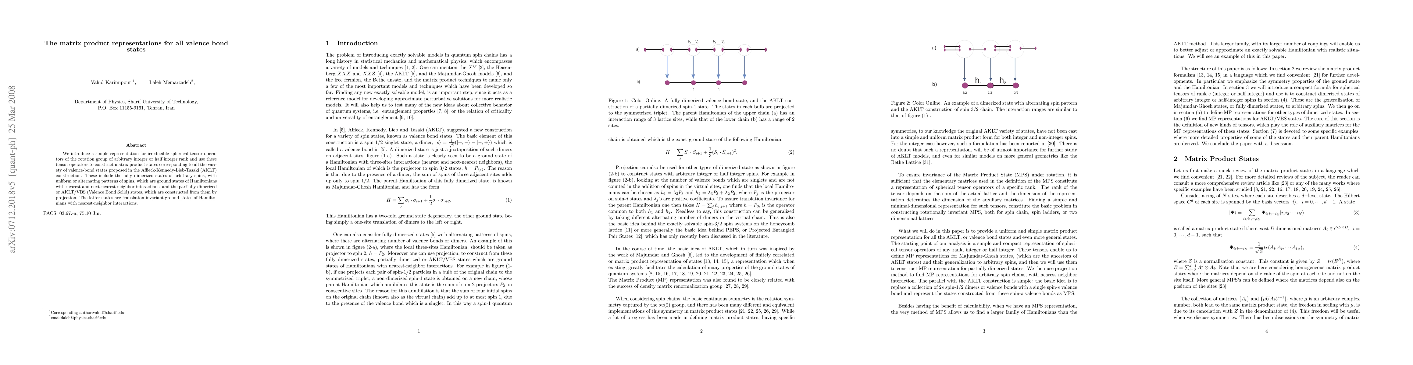 This paper presents a method for representing irreducible spherical tensor operators to construct matrix product states corresponding to various valence bond states, including fully dimerized states and partially dimerized AKLT/VBS states, which serve as ground states for different Hamiltonian interactions.