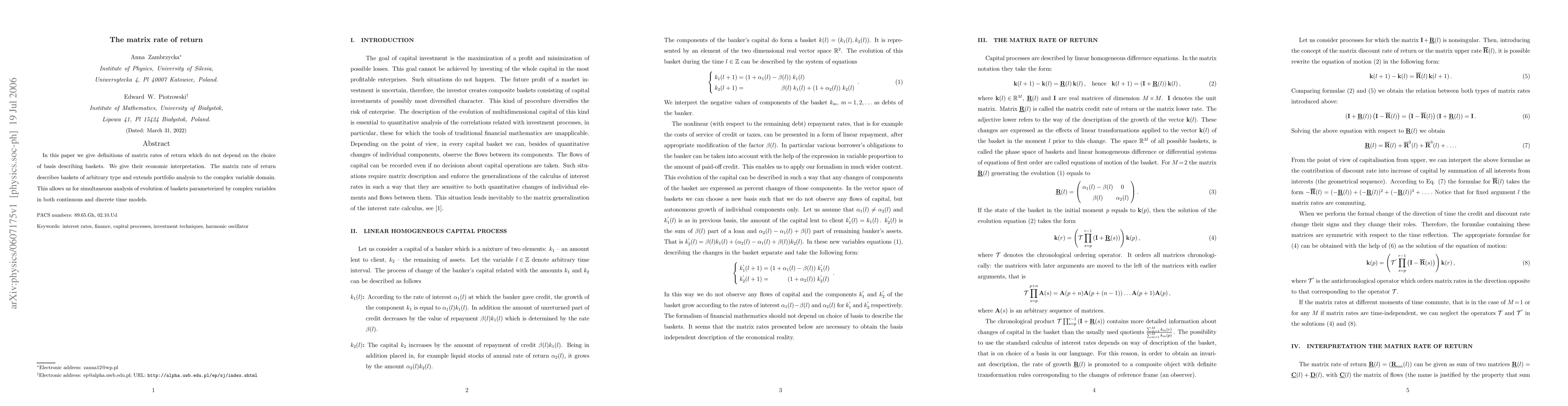This paper introduces matrix rates of return independent of the basis used to describe baskets, providing an economic interpretation and extending portfolio analysis to complex variable domains for simultaneous analysis in continuous and discrete time models.