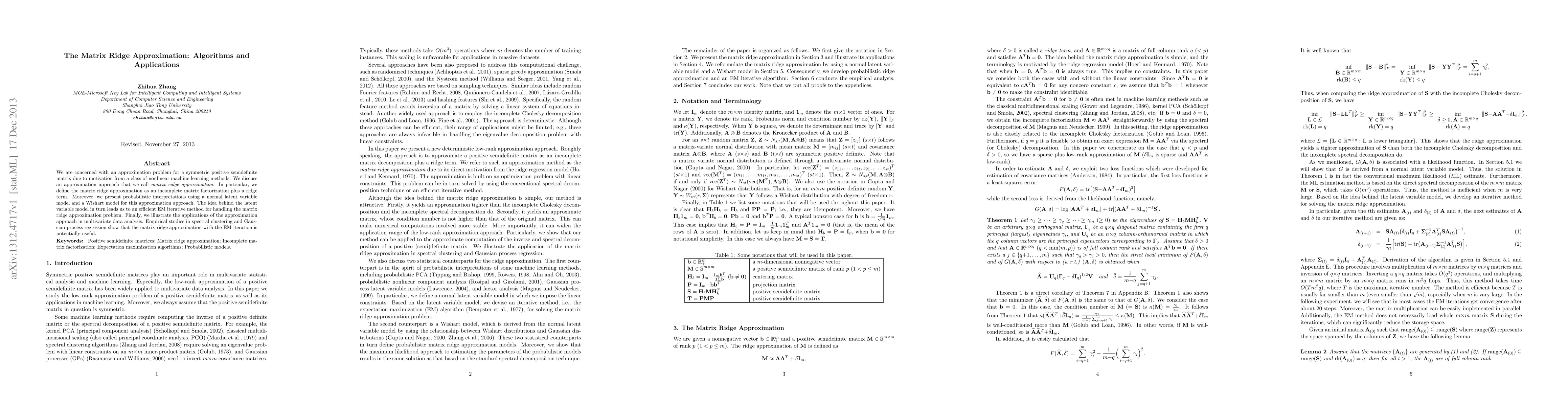 This paper introduces the matrix ridge approximation, an incomplete matrix factorization enhanced by a ridge term, motivated by nonlinear machine learning methods. It employs probabilistic models and an EM algorithm for efficient computation, demonstrating its utility in spectral clustering and Gaussian process regression.