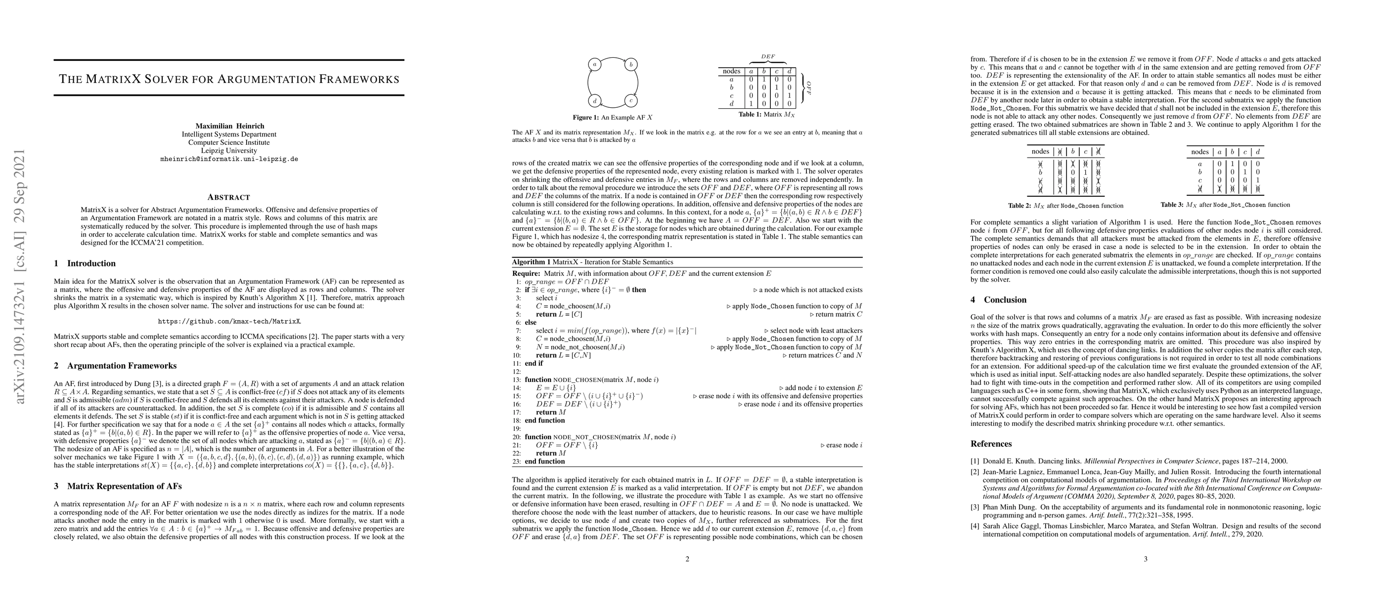 The MatrixX solver efficiently processes Abstract Argumentation Frameworks by representing offensive and defensive properties in a matrix format, utilizing hash maps to expedite calculations and supporting stable and complete semantics. It was developed for the ICCMA 2021 competition.