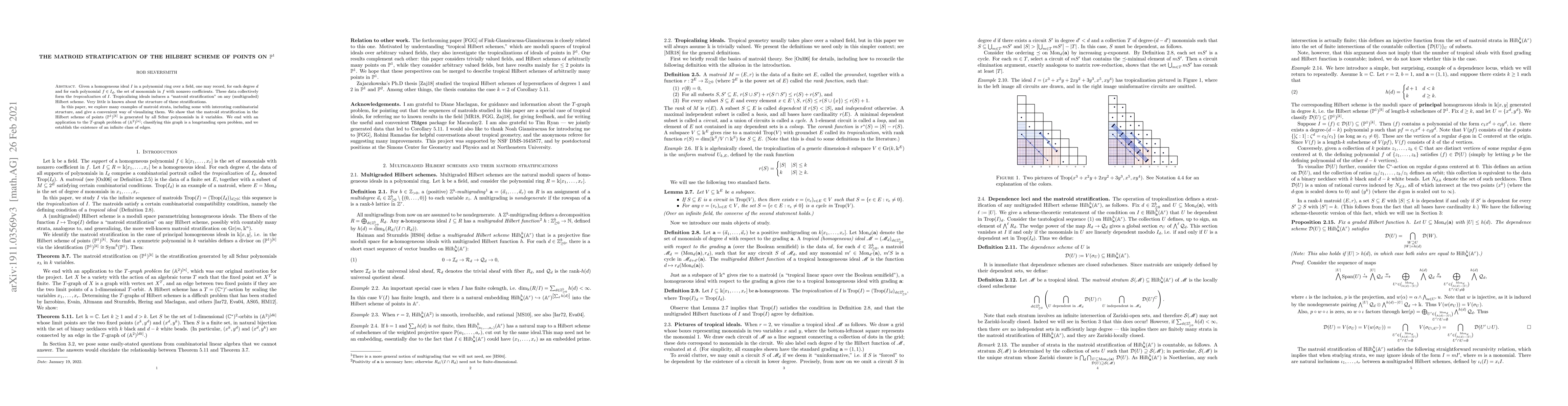 This paper explores the matroid stratification of the Hilbert scheme of points on $\mathbb{P}^1$, using tropicalization of ideals to generate these strata. It provides examples with notable combinatorial structures and demonstrates that the stratification in $(\mathbb{P}^1)^{[k]}$ is generated by Schur polynomials, concluding with an application to the $T$-graph problem in $(\mathbb{A}^2)^{[n]}$.