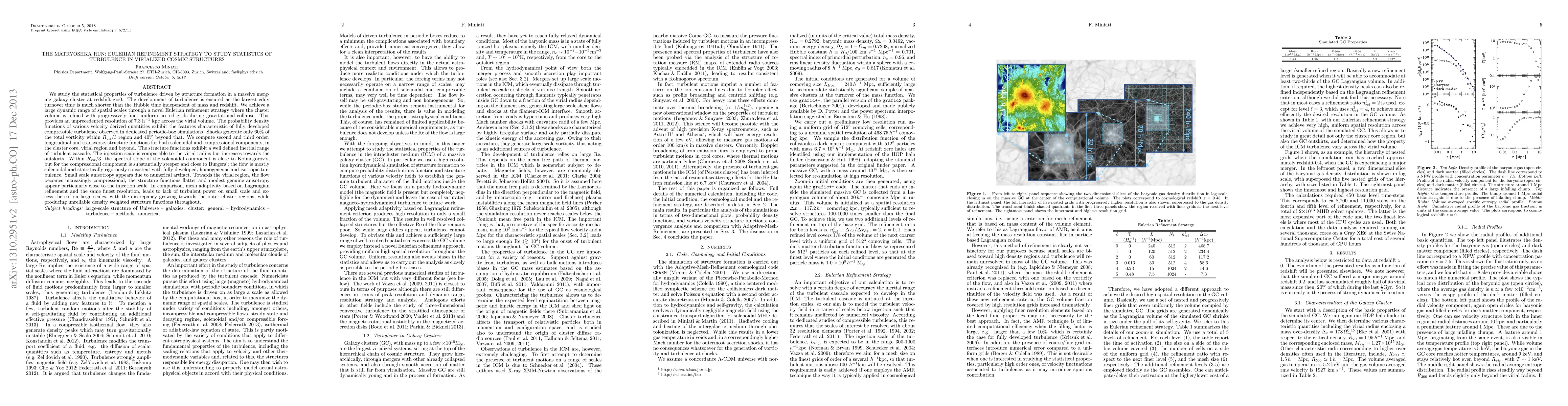 We study the statistical properties of turbulence driven by structure formation in a massive merging galaxy cluster at z=0. The development of turbulence is ensured as the largest eddy turnover time is much shorter than the Hubble time independent of mass and redshift. We achieve a large dynamic range of spatial scales through a novel Eulerian refinement strategy where the cluster volume is refined with progressively finer uniform nested grids during gravitational collapse. This provides an unprecedented resolution of 7.3 h^{-1} kpc across the virial volume. The probability density functions of various velocity derived quantities exhibit the features characteristic of fully developed compressible turbulence observed in dedicated periodic-box simulations. Shocks generate only 60% of the total vorticity within \rvir/3 region and 40% beyond that. We compute second and third order, longitudinal and transverse, structure functions for both solenoidal and compressional components, in the cluster core, virial region and beyond. The structure functions exhibit a well defined inertial range. The injection scale is comparable to the virial radius but increases towards the outskirts. Within \rvir/3, the spectral slope of the solenoidal component is close to Kolmogorov's, but for the compressional component is substantially steeper and close to Burgers'; the flow is mostly solenoidal and statistically rigorously consistent with fully developed, homogeneous and isotropic turbulence. Small scale anisotropy appears due to numerical artifact. Towards the virial region, the flow becomes compressional, the structure functions flatter and modest genuine anisotropy appear. In comparison, mesh adaptivity based on Lagrangian refinement and the same finest resolution, leads to lack of turbulent power on small scale and excess thereof on large scales, and unreliable density weighted structure functions.