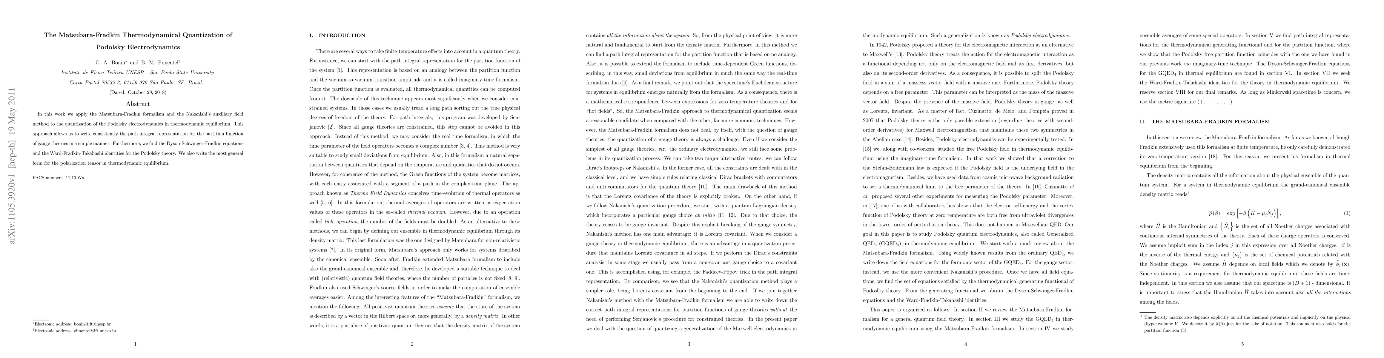 This paper quantizes Podolsky electrodynamics using the Matsubara-Fradkin formalism and Nakanishi's auxiliary field method, deriving Dyson-Schwinger-Fradkin equations and Ward-Fradkin-Takahashi identities, and presenting the path integral representation for the partition function in thermodynamic equilibrium.