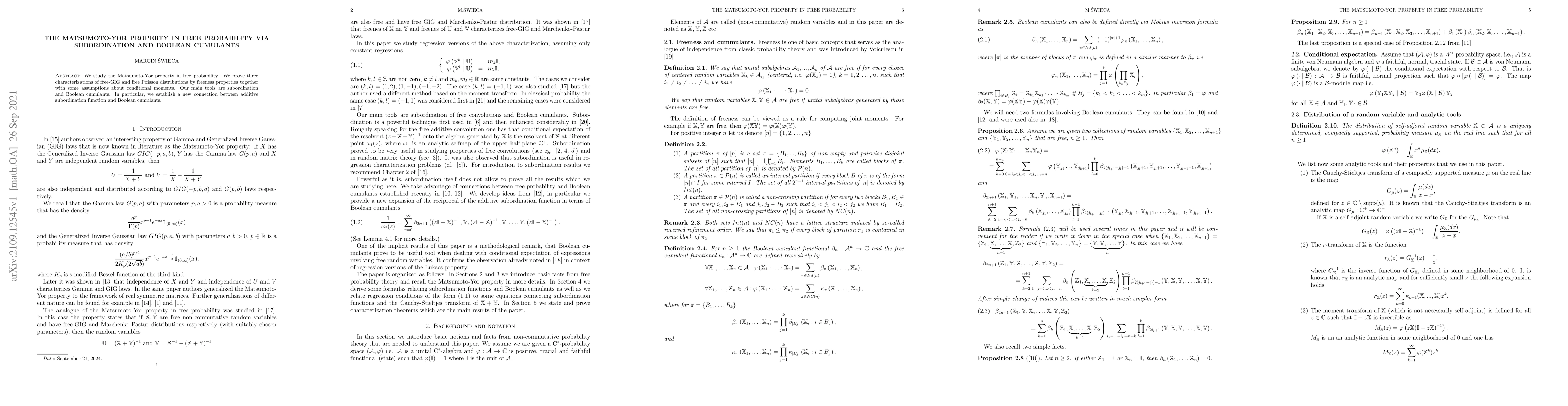 This paper explores the Matsumoto-Yor property in free probability, proving three characterizations of free-GIG and free Poisson distributions using subordination and Boolean cumulants. It establishes a novel link between additive subordination functions and Boolean cumulants.