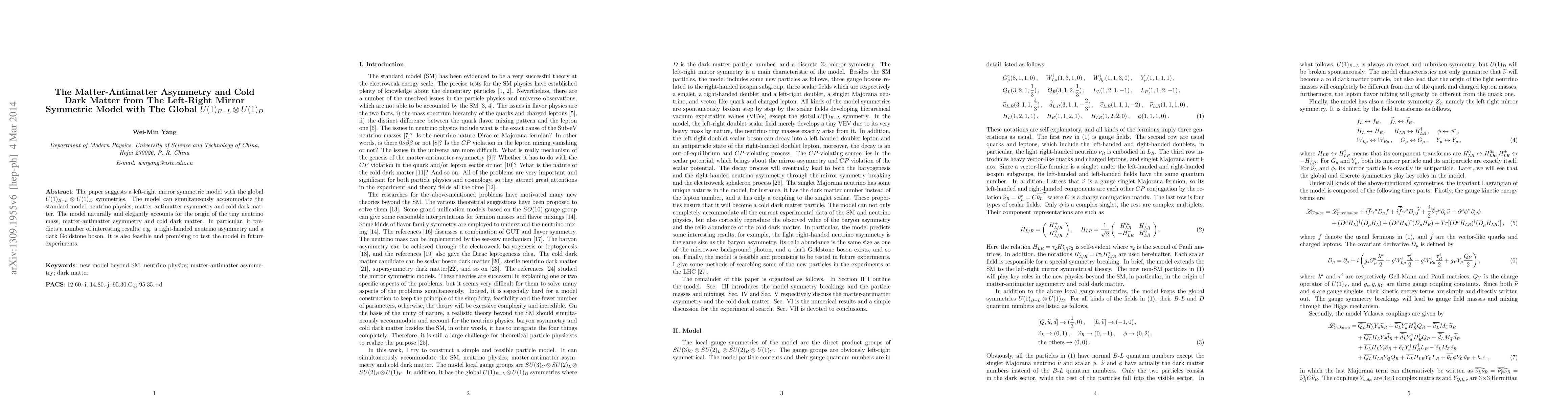 The paper suggests a left-right mirror symmetric model with the global $U(1)_{B-L}\otimes U(1)_{D}$ symmetries. The model can simultaneously accommodate the standard model, neutrino physics, matter-antimatter asymmetry and cold dark matter. The model naturally and elegantly accounts for the origin of the tiny neutrino mass, matter-antimatter asymmetry and cold dark matter. In particular, it predicts a number of interesting results, e.g. a right-handed neutrino asymmetry and a dark Goldstone boson. It is also feasible and promising to test the model in future experiments.