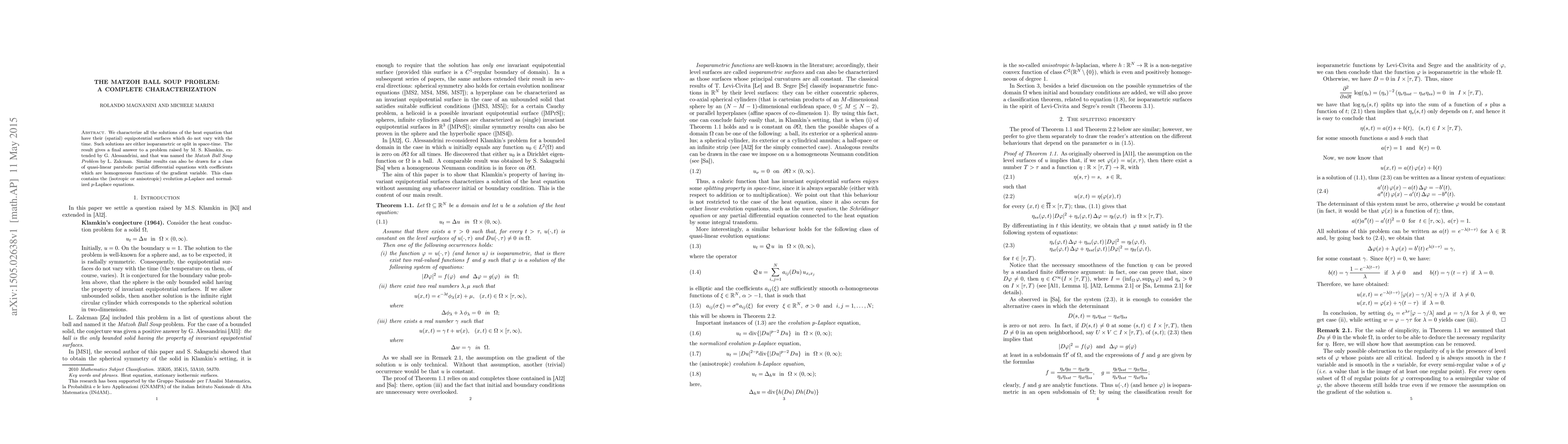 We characterize all the solutions of the heat equation that have their (spatial) equipotential surfaces which do not vary with the time. Such solutions are either isoparametric or split in space-time. The result gives a final answer to a problem raised by M. S. Klamkin, extended by G. Alessandrini, and that was named the Matzoh Ball Soup Problem by L. Zalcman. Similar results can also be drawn for a class of quasi-linear parabolic partial differential equations with coefficients which are homogeneous functions of the gradient variable. This class contains the (isotropic or anisotropic) evolution p-Laplace and normalized p-Laplace equations.