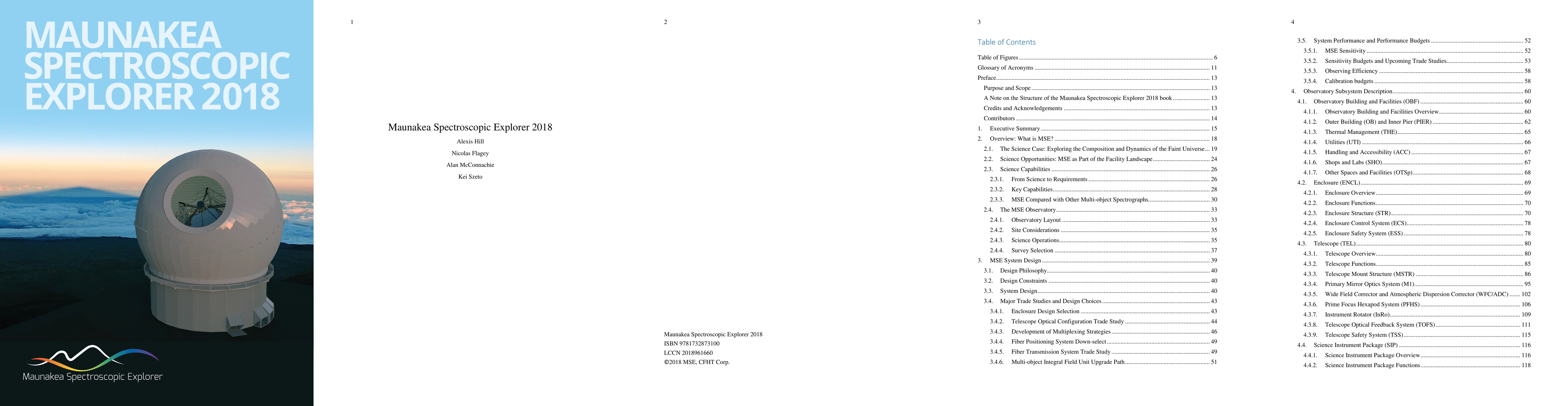 The Maunakea Spectroscopic Explorer (MSE) 2018 book serves as a reference guide detailing the scientific and technical design of MSE, a planned 10-m class optical and near-infrared facility dedicated to multi-object spectroscopy. It aims to fill a critical gap in the international network of large-scale astronomical facilities by observing thousands to millions of astrophysical objects with unprecedented capabilities.