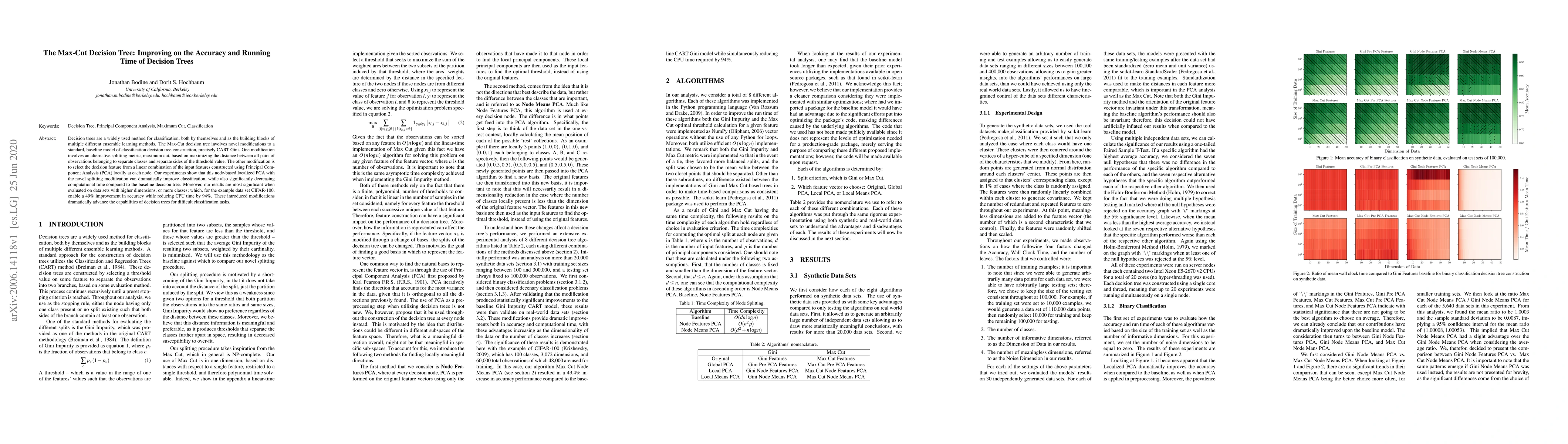 Decision trees are a widely used method for classification, both by themselves and as the building blocks of multiple different ensemble learning methods. The Max-Cut decision tree involves novel modifications to a standard, baseline model of classification decision tree construction, precisely CART Gini. One modification involves an alternative splitting metric, maximum cut, based on maximizing the distance between all pairs of observations belonging to separate classes and separate sides of the threshold value. The other modification is to select the decision feature from a linear combination of the input features constructed using Principal Component Analysis (PCA) locally at each node. Our experiments show that this node-based localized PCA with the novel splitting modification can dramatically improve classification, while also significantly decreasing computational time compared to the baseline decision tree. Moreover, our results are most significant when evaluated on data sets with higher dimensions, or more classes; which, for the example data set CIFAR-100, enable a 49% improvement in accuracy while reducing CPU time by 94%. These introduced modifications dramatically advance the capabilities of decision trees for difficult classification tasks.
