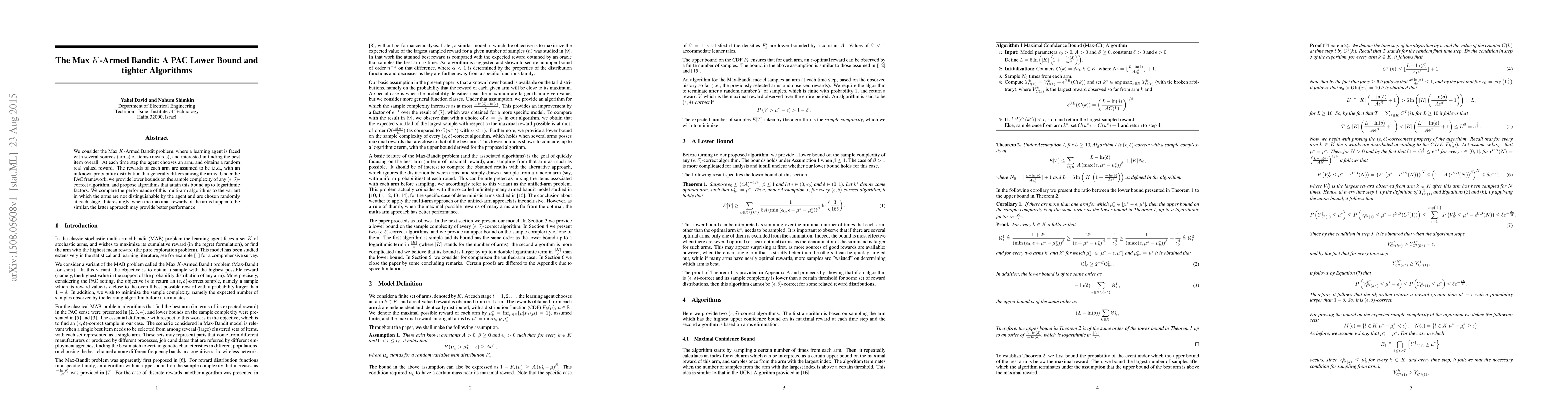 This paper explores the Max $K$-Armed Bandit problem, establishing PAC lower bounds for sample complexity and proposing algorithms that nearly achieve these bounds. It also compares the performance of distinguishable versus indistinguishable arms, finding that similar maximal rewards can benefit the latter approach.
