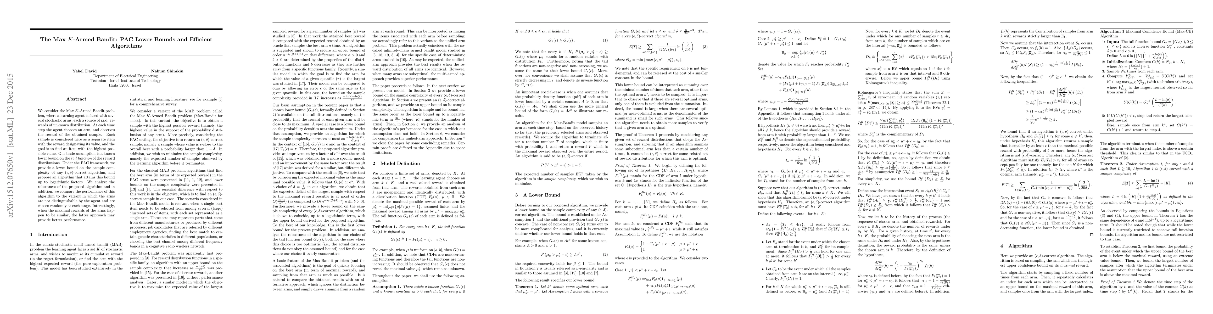This paper studies the Max $K$-Armed Bandit problem under the PAC framework, establishing a lower bound on sample complexity and proposing an efficient algorithm that nearly achieves this bound. The paper also analyzes the robustness of the algorithm and compares it to a variant where arms are indistinguishable.