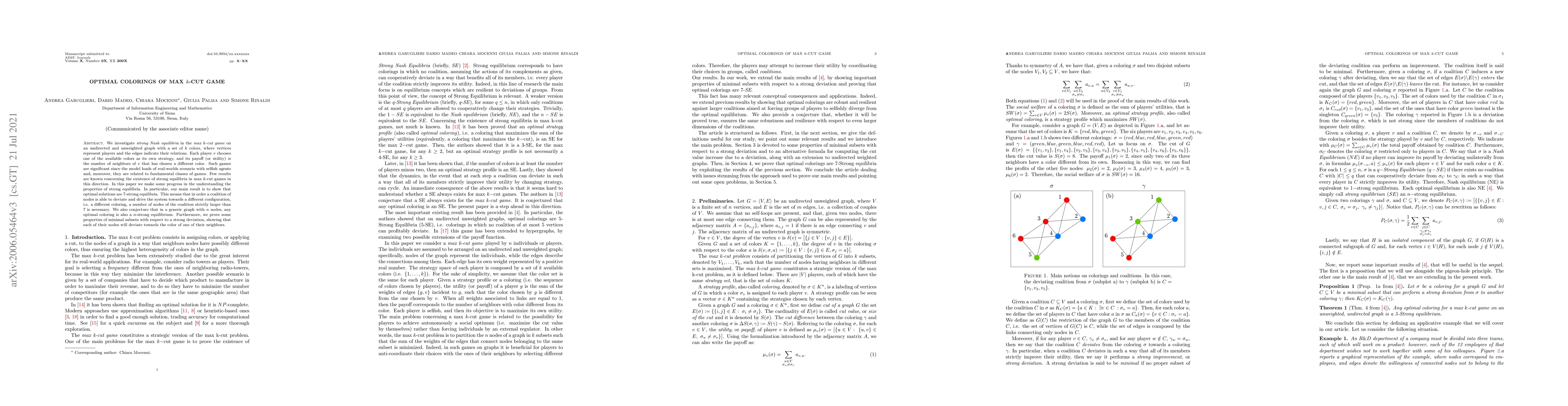 This paper investigates the max k-cut game on undirected graphs, exploring whether optimal solutions are strong equilibria. Although it does not prove this, it demonstrates that optimal solutions are 7-stable equilibria and provides properties of minimal subsets under strong deviation, showing they induce connected subgraphs.