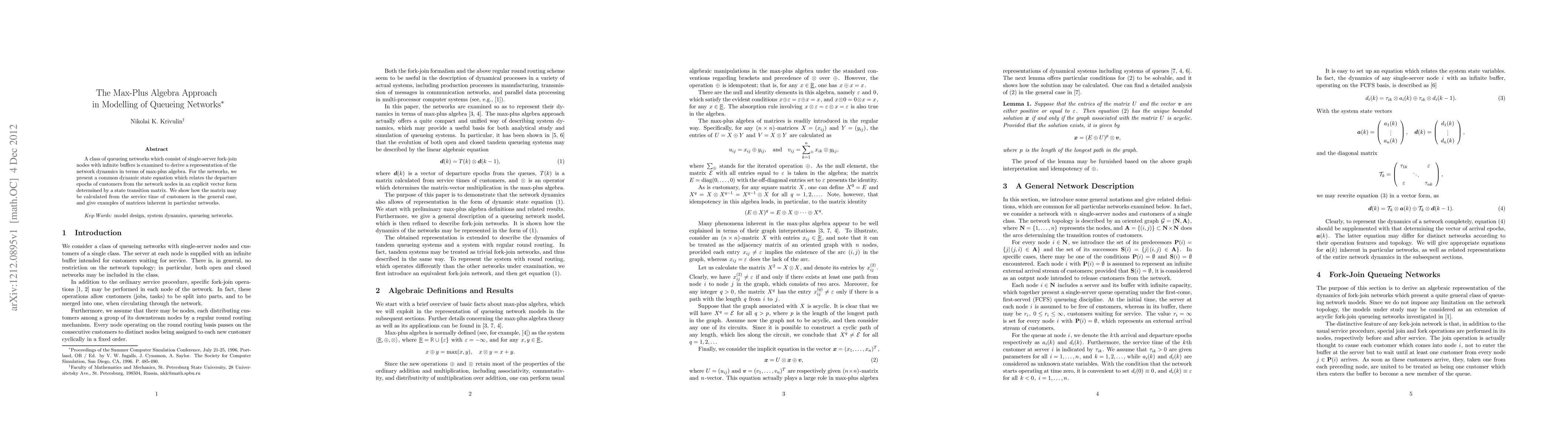 This paper utilizes max-plus algebra to model queueing networks with single-server fork-join nodes and infinite buffers. It presents a dynamic state equation that explicitly links customer departure epochs through a state transition matrix derived from service times.