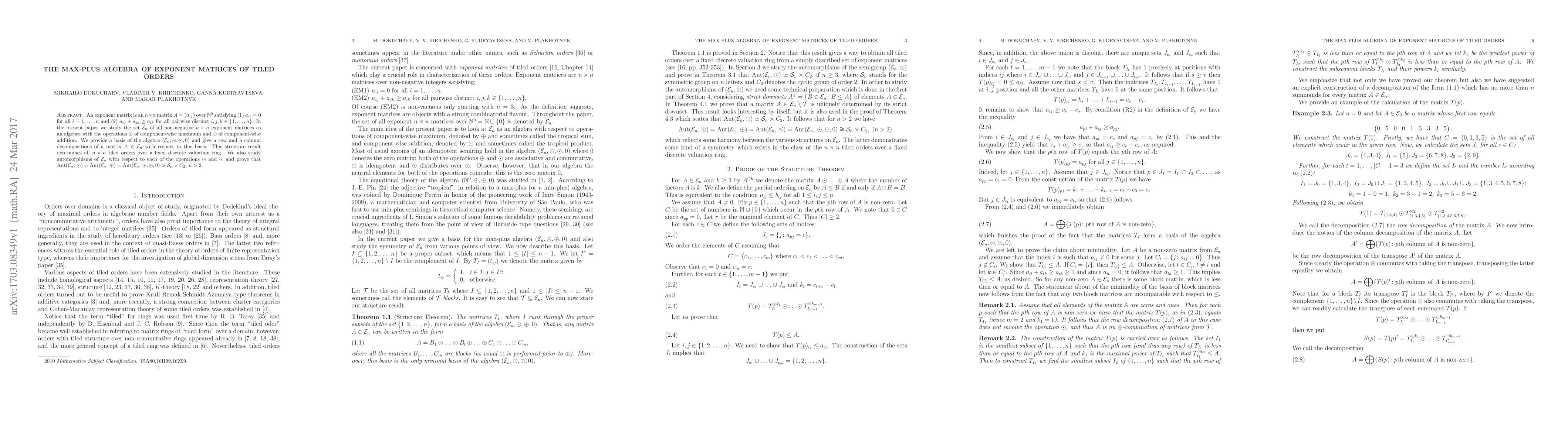 An exponent matrix is an $n\times n$ matrix $A=(a_{ij})$ over ${\mathbb N}^0$ satisfying (1) $a_{ii}=0$ for all $i=1,\ldots, n$ and (2) $a_{ij}+a_{jk}\geq a_{ik}$ for all pairwise distinct $i,j,k\in\{1,\dots, n\}$. In the present paper we study the set ${\mathcal E}_n$ of all non-negative $n\times n$ exponent matrices as an algebra with the operations $\oplus$ of component-wise maximum and $\odot$ of component-wise addition. We provide a basis of the algebra $({\mathcal E}_n, \oplus, \odot,0)$ and give a row and a column decompositions of a matrix $A\in {\mathcal E}_n$ with respect to this basis. This structure result determines all $n\times n$ tiled orders over a fixed discrete valuation ring. We also study automorphisms of ${\mathcal E}_n$ with respect to each of the operations $\oplus$ and $\odot$ and prove that ${\rm Aut}(\mathcal{E}_n,\, \odot ) = {\rm Aut}(\mathcal{E}_n,\, \oplus ) = {\rm Aut}(\mathcal{E}_n,\, \odot ,\oplus ,0) \simeq {\mathcal{S}}_n \times C_2,$$n>2.$