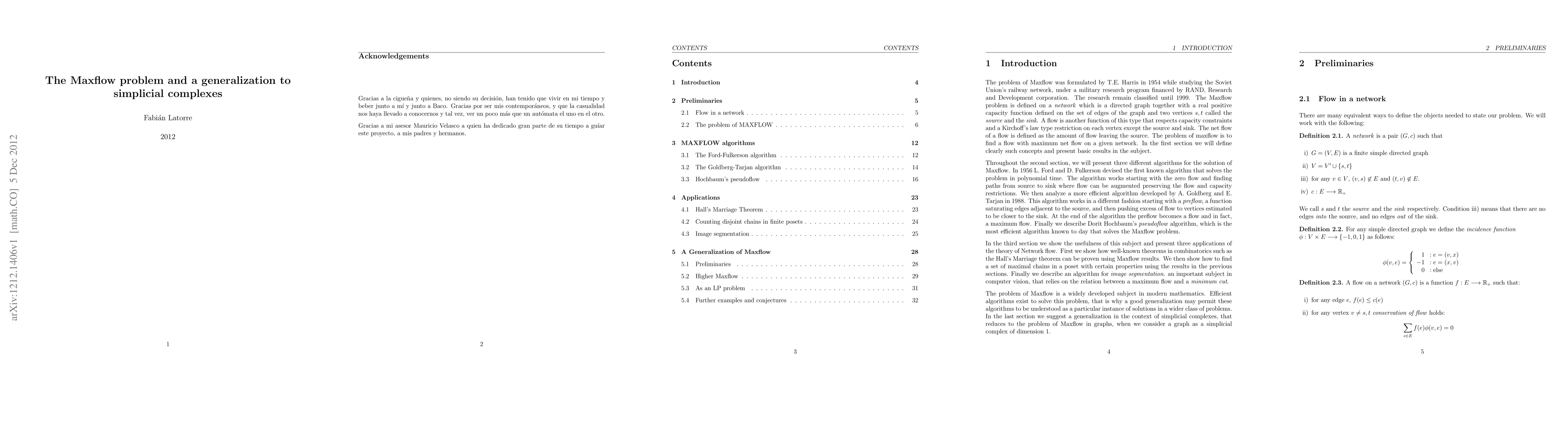 The problem of Maxflow is a widely developed subject in modern mathematics. Efficient algorithms exist to solve this problem, that is why a good generalization may permit these algorithms to be understood as a particular instance of solutions in a wider class of problems. In the last section we suggest a generalization in the context of simplicial complexes, that reduces to the problem of Maxflow in graphs, when we consider a graph as a simplicial complex of dimension 1.