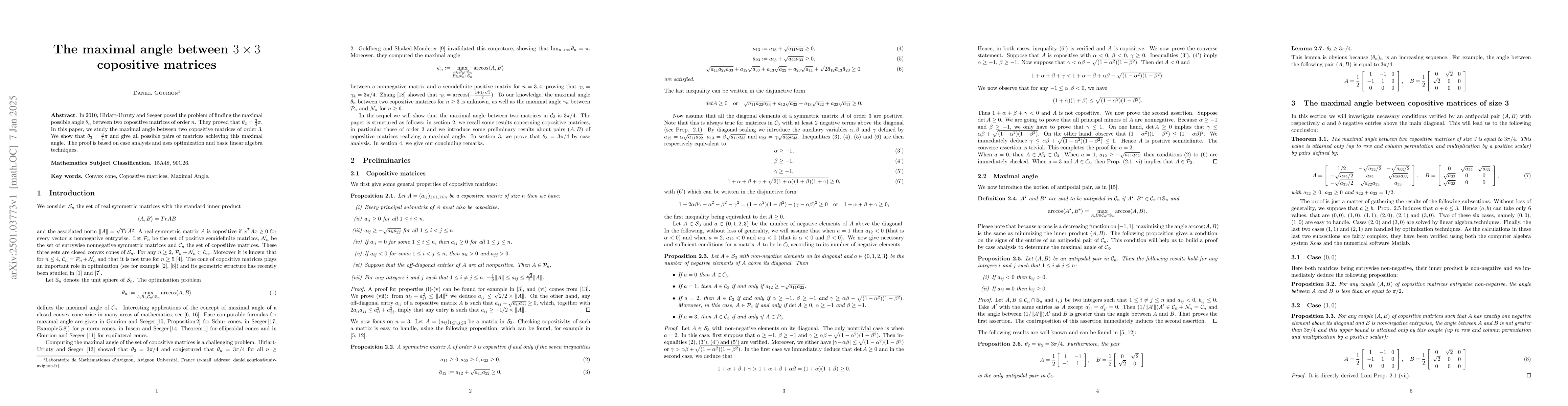 This paper investigates the maximal angle $\theta_3$ between two $3 \times 3$ copositive matrices, proving that $\theta_3 = \frac{3}{4}\pi$ and identifying all pairs achieving this maximal angle through case analysis and optimization techniques.
