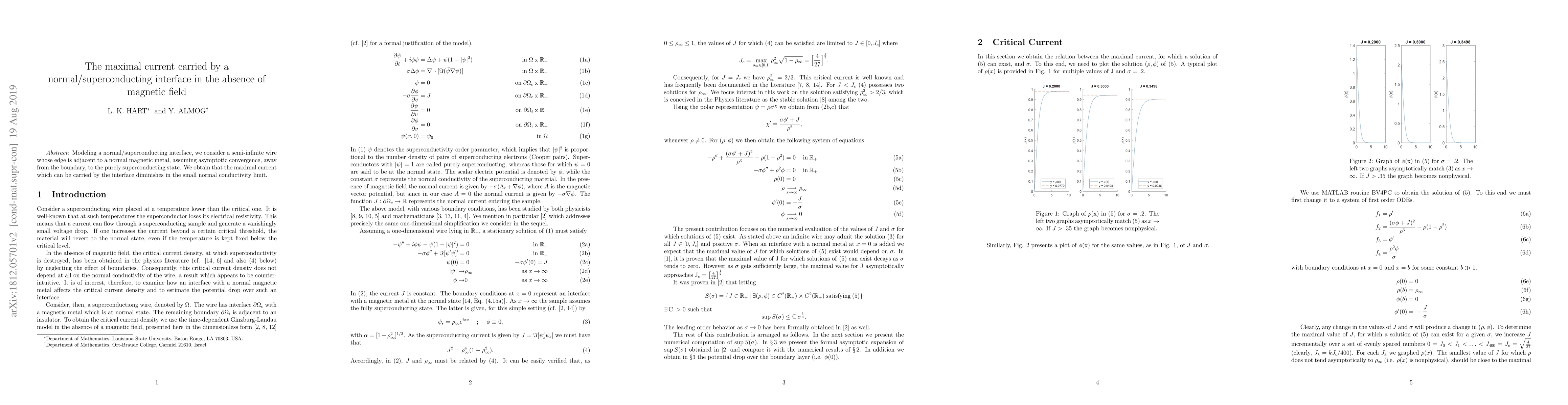 The research investigates a semi-infinite wire at a normal-superconducting interface without magnetic fields, finding that the maximum current the interface can carry decreases as the normal conductivity approaches zero.