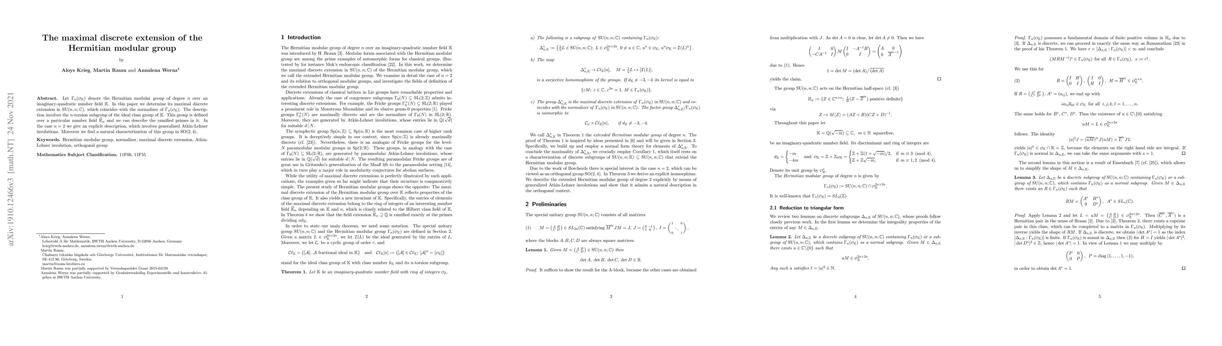Let $\Gamma_n(\mathcal{\scriptstyle{O}}_\mathbb{K})$ denote the Hermitian modular group of degree $n$ over an imaginary-quadratic number field $\mathbb{K}$. In this paper we determine its maximal discrete extension in $SU(n,n;\mathbb{C})$, which coincides with the normalizer of $\Gamma_n(\mathcal{\scriptstyle{O}}_{\mathbb{K}})$. The description involves the $n$-torsion subgroup of the ideal class group of $\mathbb{K}$. This group is defined over a particular number field $\widehat{\mathbb{K}}_n$ and we can describe the ramified primes in it. In the case $n=2$ we give an explicit description, which involves generalized Atkin-Lehner involutions. Moreover we find a natural characterization of this group in $SO(2,4)$.