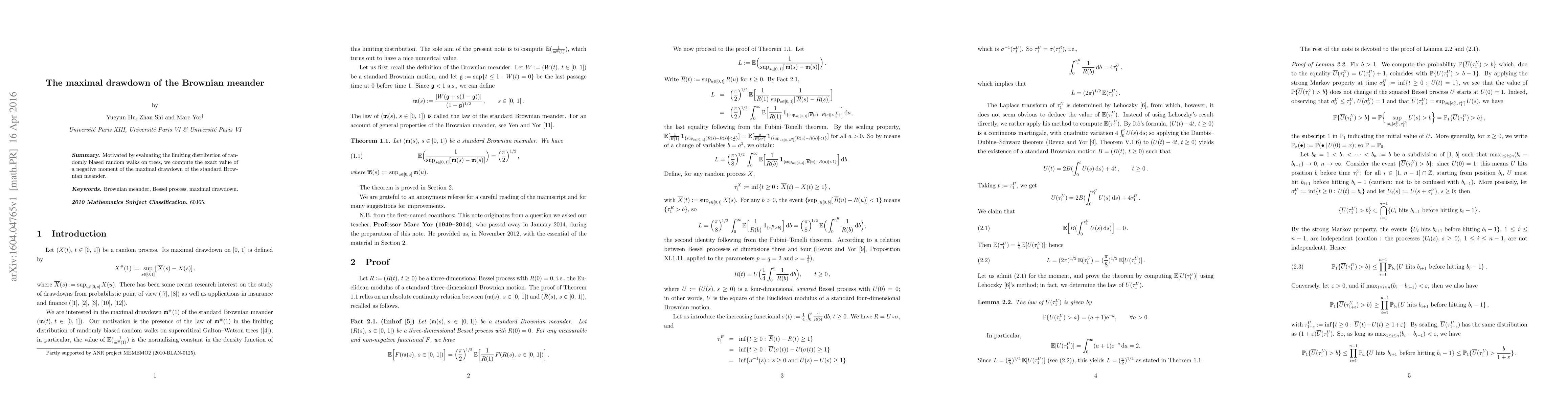 Summary: This paper calculates the exact value of a negative moment for the maximal drawdown of the standard Brownian meander, motivated by understanding the limiting distribution of biased random walks on trees. The study provides significant insights into the probabilistic behavior of these stochastic processes.