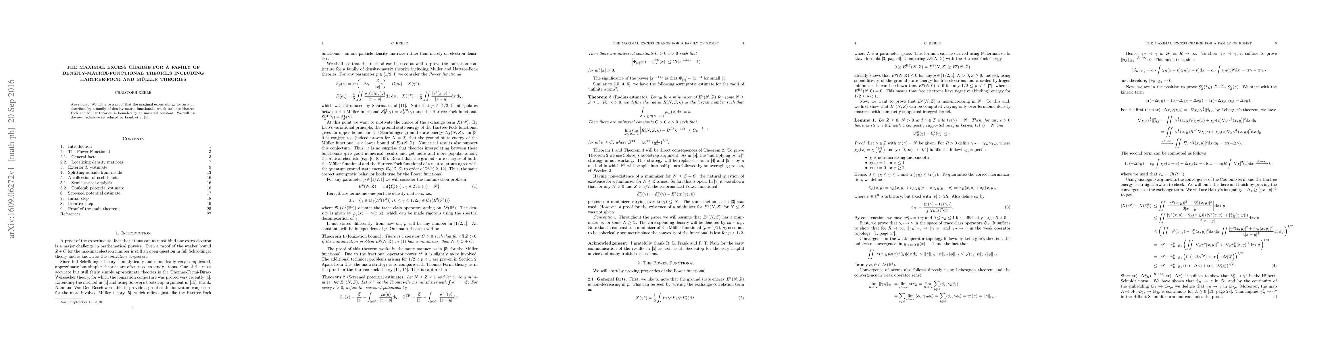 We will give a proof that the maximal excess charge for an atom described by a family of density-matrix-functionals, which includes Hartree-Fock and M\"uller theories, is bounded by an universal constant. We will use the new technique introduced by Frank et al (arXiv:1608.05625 [math-ph]).