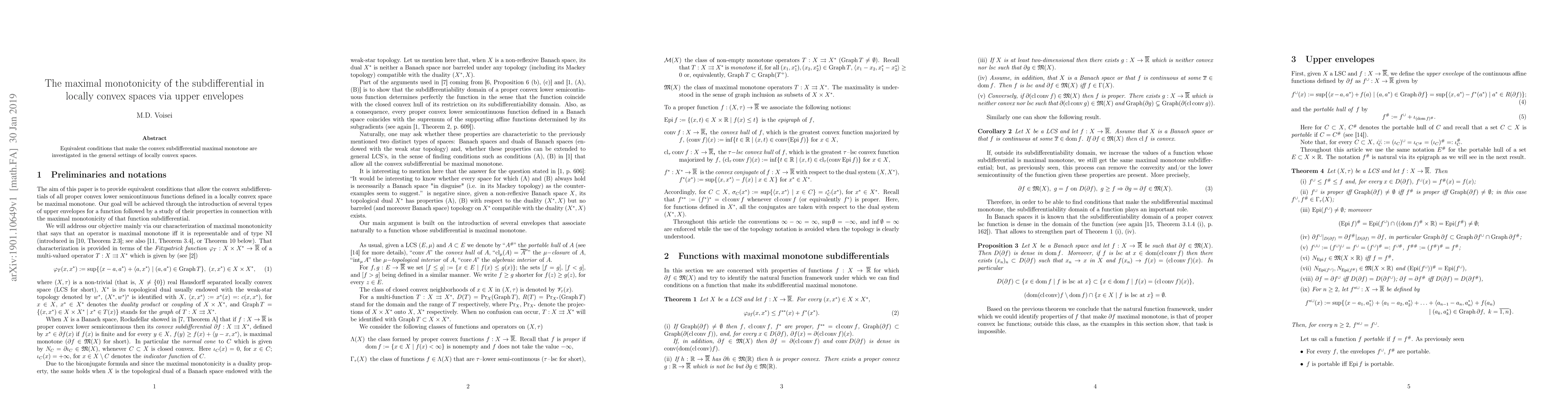 Summary: This paper explores conditions ensuring the maximal monotonicity of the convex subdifferential in locally convex spaces, focusing on the role of upper envelopes in achieving this property. The findings provide insights into the structural properties of subdifferentials in such settings.