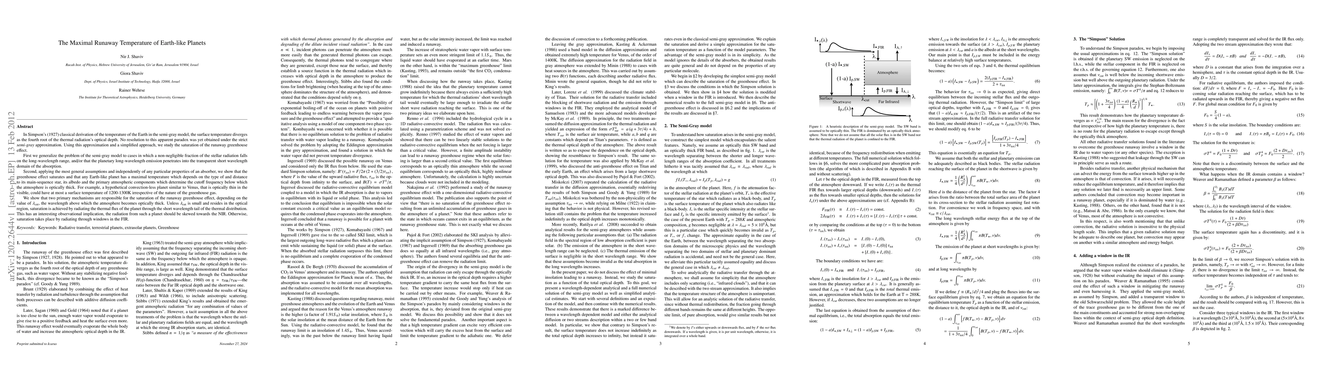 We generalize the problem of the semi-gray model to cases in which a non-negligible fraction of the stellar radiation falls on the long-wavelength range, and/or that the planetary long-wavelength emission penetrates into the transparent short wavelength domain of the absorption. Second, applying the most general assumptions and independently of any particular properties of an absorber, we show that the greenhouse effect saturates and any Earth-like planet has a maximal temperature which depends on the type of and distance to its main-sequence star, its albedo and the primary atmospheric components which determine the cutoff frequency below which the atmosphere is optically thick. For example, a hypothetical convection-less planet similar to Venus, that is optically thin in the visible, could have at most a surface temperature of 1200-1300K irrespective of the nature of the greenhouse gas. We show that two primary mechanisms are responsible for the saturation of the runaway greenhouse effect, depending on the value of the wavelength above which the atmosphere becomes optically thick. Unless this wavelength is small and resides in the optical region, saturation is achieved by radiating the thermal flux of the planet through the short wavelength tail of the thermal distribution. This has the observational implication, the radiation from such a planet should be skewed towards the NIR. Otherwise, saturation takes place by radiating through windows in the FIR.
