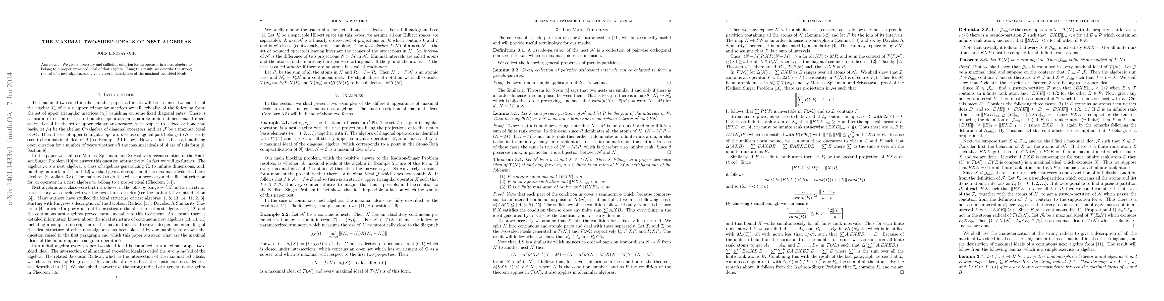 We give a necessary and sufficient criterion for an operator in a nest algebra to belong to a proper two-sided ideal of that algebra. Using this result, we describe the strong radical of a nest algebra, and give a general description of the maximal two-sided ideals.