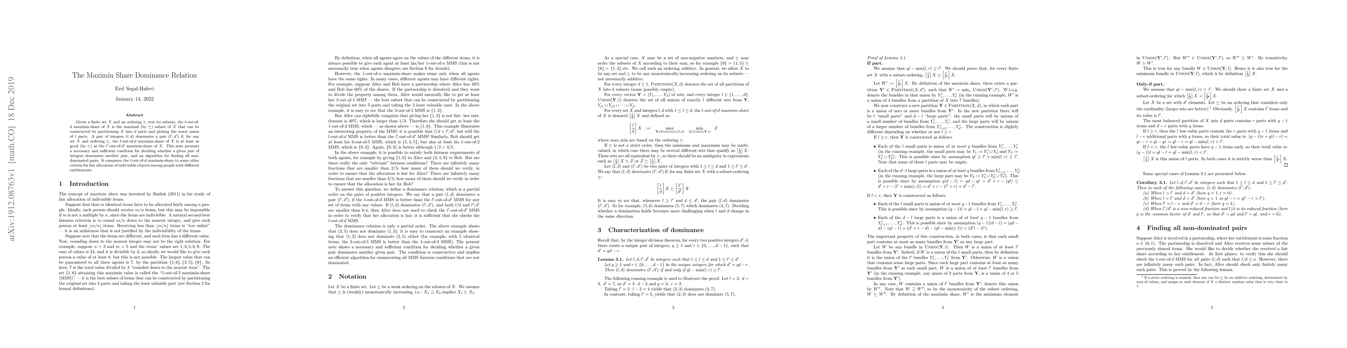 Given a finite set $X$ and an ordering $\succeq$ over its subsets, the $l$-out-of-$d$ maximin-share of $X$ is the maximal (by $\succeq$) subset of $X$ that can be constructed by partitioning $X$ into $d$ parts and picking the worst union of $l$ parts. A pair of integers $(l,d)$ dominates a pair $(l',d')$ if, for any set $X$ and ordering $\succeq$, the $l$-out-of-$d$ maximin-share of $X$ is at least as good (by $\succeq$) as the $l'$-out-of-$d'$ maximin-share of $X$. This note presents a necessary and sufficient condition for deciding whether a given pair of integers dominates another pair, and an algorithm for finding all non-dominated pairs. It compares the $l$-out-of-$d$ maximin-share to some other criteria for fair allocation of indivisible objects among people with different entitlements.
