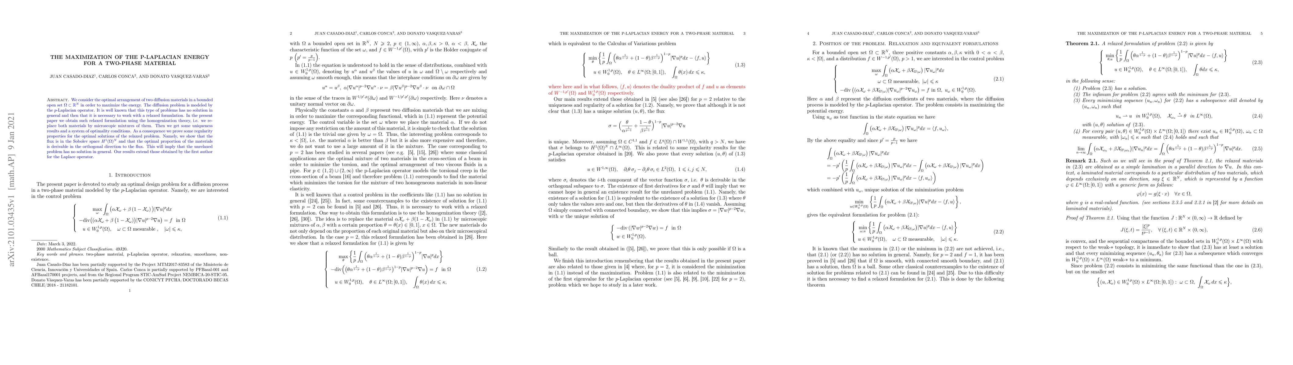 We consider the optimal arrangement of two diffusion materials in a bounded open set $\Omega\subset \mathbb{R}^N$ in order to maximize the energy. The diffusion problem is modeled by the $p$-Laplacian operator. It is well known that this type of problems has no solution in general and then that it is necessary to work with a relaxed formulation. In the present paper we obtain such relaxed formulation using the homogenization theory, i.e. we replace both materials by microscopic mixtures of them. Then we get some uniqueness results and a system of optimality conditions. As a consequence we prove some regularity properties for the optimal solutions of the relaxed problem. Namely, we show that the flux is in the Sobolev space $H^1(\Omega)^N$ and that the optimal proportion of the materials is derivable in the orthogonal direction to the flux. This will imply that the unrelaxed problem has no solution in general. Our results extend those obtained by the first author for the Laplace operator.