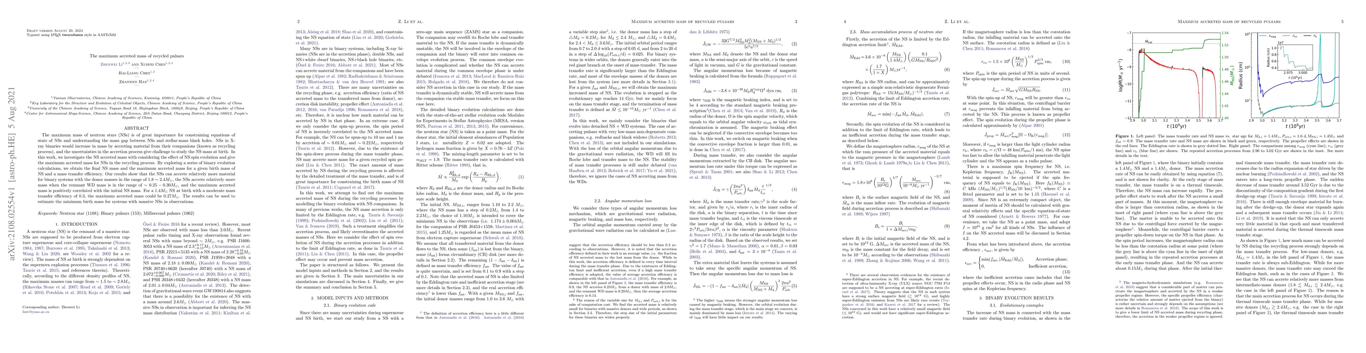 The maximum mass of neutron stars (NSs) is of great importance for constraining equations of state of NSs and understanding the mass gap between NSs and stellar-mass black holes. NSs in X-ray binaries would increase in mass by accreting material from their companions (known as recycling process), and the uncertainties in the accretion process give challenge to study the NS mass at birth. {In this work, we investigate the NS accreted mass with considering the effect of NS spin evolution and give the maximum accreted mass for NSs in the recycling process. By exploring a series of binary evolution calculations, we obtain the final NS mass and the maximum accreted mass for a given birth mass of NS and a mass transfer efficiency. Our results show that the NSs can accrete relatively more material for binary systems with the donor masses in the range of $1.8\sim 2.4M_\odot$, the NSs accrete relatively more mass when the remnant WD mass is in the range of $\sim 0.25-0.30M_\odot$, and the maximum accreted mass is positively correlated with the initial NS mass. For a $1.4M_\odot$ NS at birth with a moderate mass transfer efficiency of 0.3, the maximum accreted mass could be $0.27M_\odot$. The results can be used to estimate the minimum birth mass for systems with massive NSs in observations.