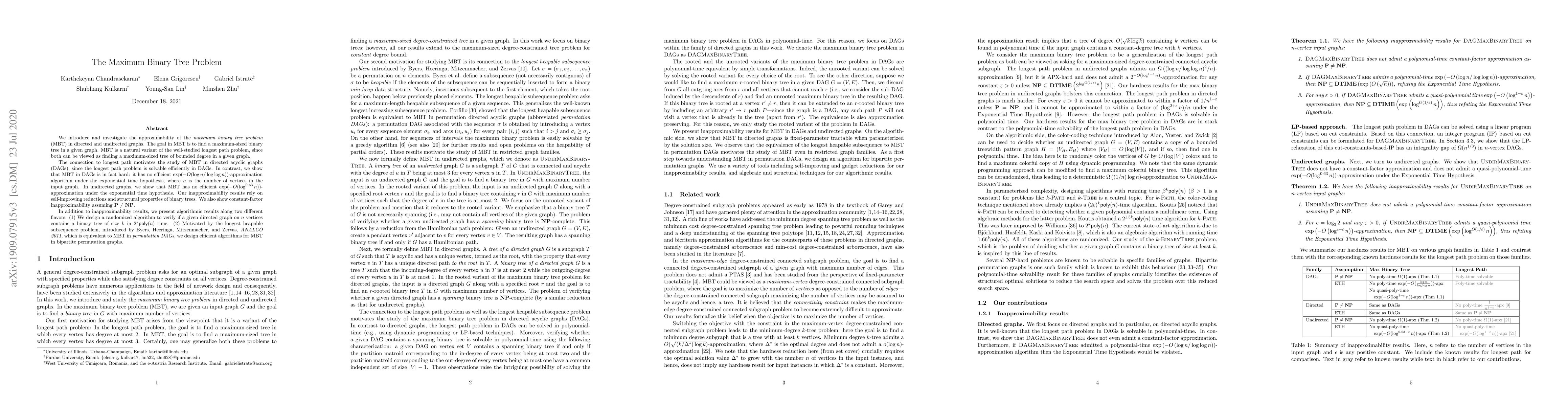 We introduce and investigate the approximability of the maximum binary tree problem (MBT) in directed and undirected graphs. The goal in MBT is to find a maximum-sized binary tree in a given graph. MBT is a natural variant of the well-studied longest path problem, since both can be viewed as finding a maximum-sized tree of bounded degree in a given graph. The connection to longest path motivates the study of MBT in directed acyclic graphs (DAGs), since the longest path problem is solvable efficiently in DAGs. In contrast, we show that MBT in DAGs is in fact hard: it has no efficient $\exp(-O(\log n/ \log \log n))$-approximation algorithm under the exponential time hypothesis, where $n$ is the number of vertices in the input graph. In undirected graphs, we show that MBT has no efficient $\exp(-O(\log^{0.63}{n}))$-approximation under the exponential time hypothesis. Our inapproximability results rely on self-improving reductions and structural properties of binary trees. We also show constant-factor inapproximability assuming $\text{P}\neq \text{NP}$. In addition to inapproximability results, we present algorithmic results along two different flavors: (1) We design a randomized algorithm to verify if a given directed graph on $n$ vertices contains a binary tree of size $k$ in $2^k \text{poly}(n)$ time. (2) Motivated by the longest heapable subsequence problem, introduced by Byers, Heeringa, Mitzenmacher, and Zervas (ANALCO 2011), which is equivalent to MBT in permutation DAGs, we design efficient algorithms for MBT in bipartite permutation graphs.