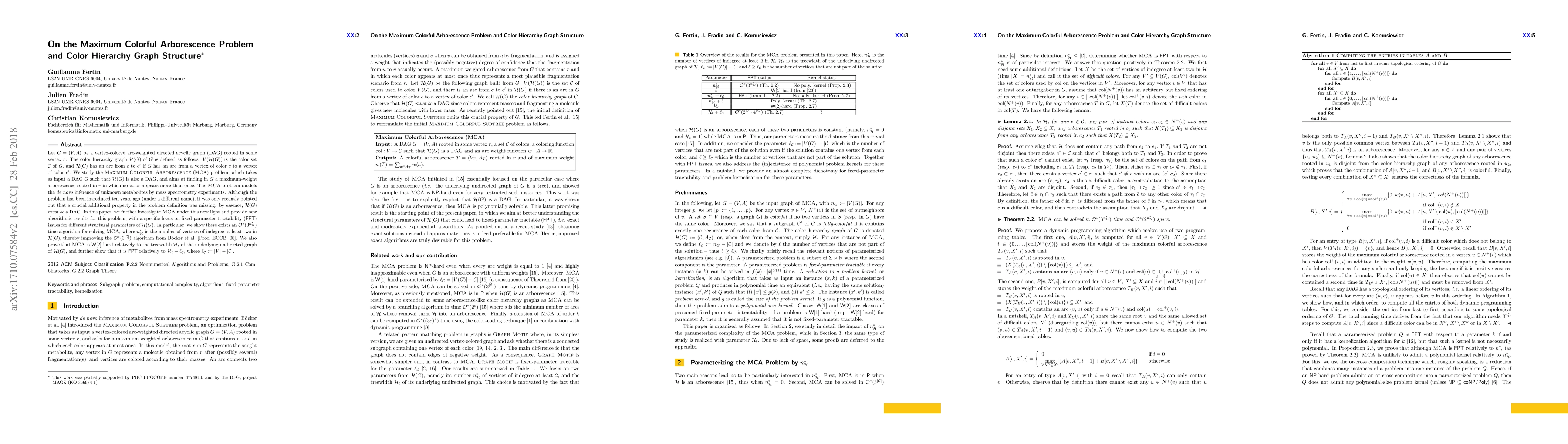 Let G=(V,A) be a vertex-colored arc-weighted directed acyclic graph (DAG) rooted in some vertex r, and let H be its color hierarchy graph, defined as follows: V(H) is the color set C of G, and an arc from color c to color c' exists in H if there is an arc in G from a vertex of color c to a vertex of color c'. In this paper, we study the MAXIMUM COLORFUL ARBORESCENCE problem (or MCA), which takes as input a DAG G with the additional constraint that H is also a DAG, and aims at finding in G an arborescence rooted in r, of maximum weight, and in which no color appears more than once. The MCA problem is motivated by the inference of unknown metabolites from mass spectrometry experiments. However, whereas the problem has been studied for roughly ten years, the crucial property that H is necessarily a DAG has only been pointed out and exploited very recently. In this paper, we further investigate MCA under this new light, by providing algorithmic results for the problem, with a specific focus on fixed-parameterized tractability (FPT) issues, and relatively to different structural parameters of H. In particular, we provide an O*(3^{nhs}) time algorithm for solving MCA, where nhs is the number of vertices of indegree at least two in H, thereby improving the O*(3^{|C|}) algorithm from [B\"ocker et al. 2008]. We also prove that MCA is W[2]-hard relatively to the treewidth Ht of H, and further show that it is FPT relatively to Ht+lc, where lc = |V| - |C|.