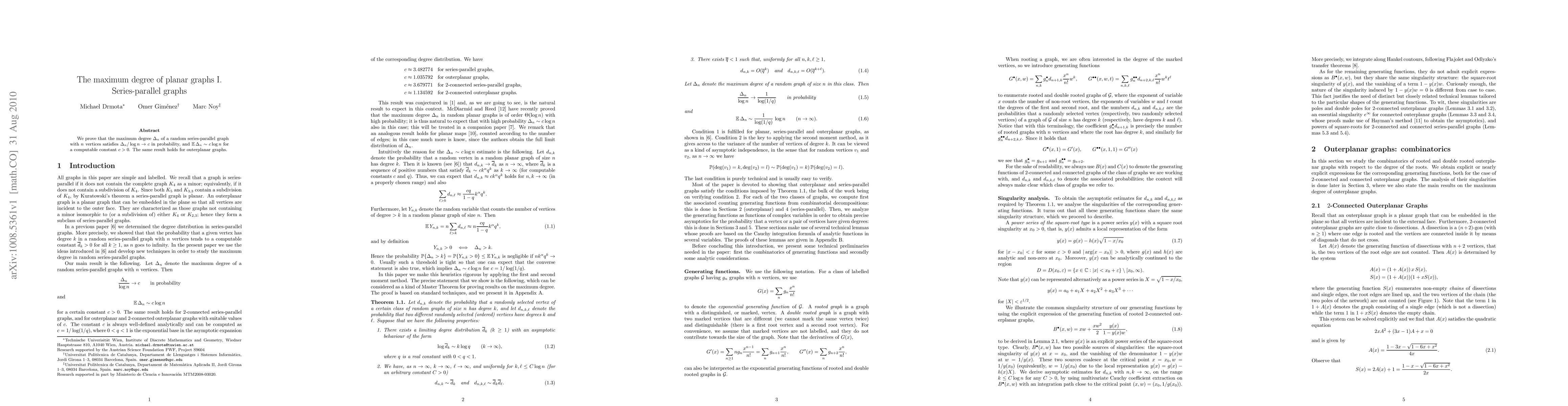 We prove that the maximum degree $\Delta_n$ of a random series-parallel graph with $n$ vertices satisfies $\Delta_n/\log n \to c$ in probability, and $\mathbb{E}\, \Delta_n \sim c \log n$ for a computable constant $c>0$. The same result holds for outerplanar graphs.