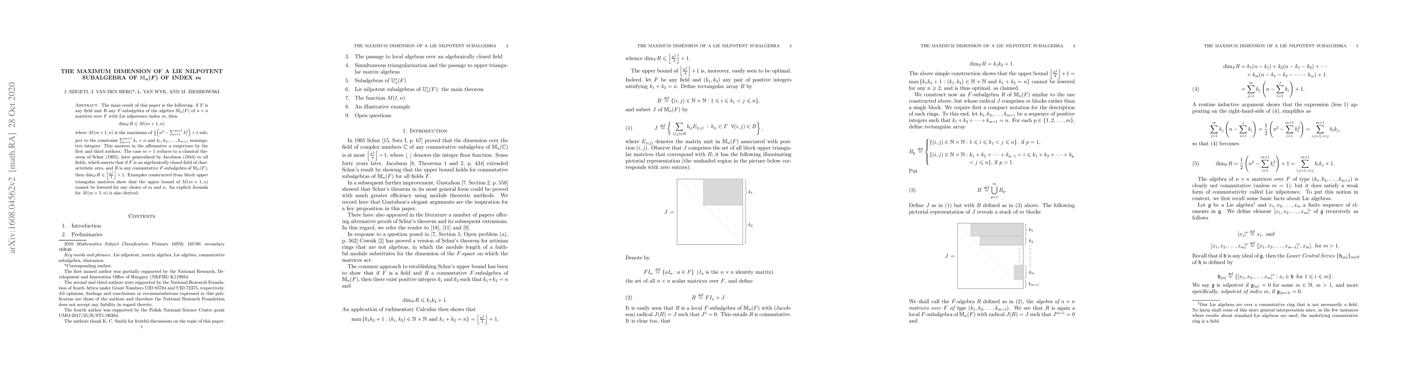 The main result of this paper is the following: if F is any field and R is any F-subalgebra of the algebra of nxn matrices over F with Lie nilpotence index m, then the F-dimension of R is less or equal than M(m+1,n), where M(m+1,n) is the maximum of a certain expression of m+1 nonnegative integers and n. The case m=1 reduces to a classical theorem of Schur (1905), later generalized by Jacobson (1944) to all fields, which asserts that if F is an algebraically closed field of characteristic zero, and R is any commutative F-subalgebra of the full nxn matrix algebra over F, then the F-dimension of R is less or equal than ((n^2)/4)+1. Examples constructed from block upper triangular matrices show that the upper bound of M(m+1,n) cannot be lowered for any choice of m and n. An explicit formula for M(m+1,n) is also derived.