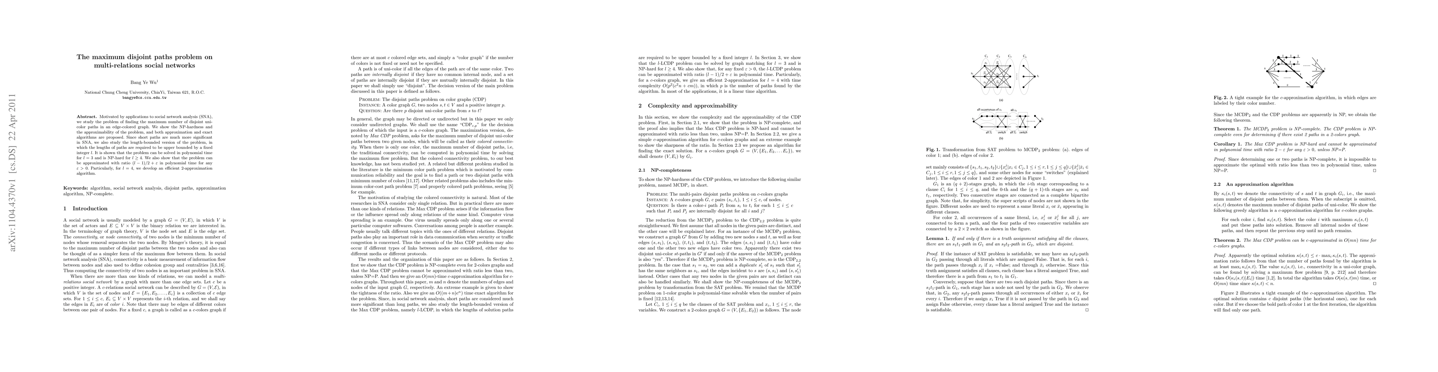 Motivated by applications to social network analysis (SNA), we study the problem of finding the maximum number of disjoint uni-color paths in an edge-colored graph. We show the NP-hardness and the approximability of the problem, and both approximation and exact algorithms are proposed. Since short paths are much more significant in SNA, we also study the length-bounded version of the problem, in which the lengths of paths are required to be upper bounded by a fixed integer $l$. It is shown that the problem can be solved in polynomial time for $l=3$ and is NP-hard for $l\geq 4$. We also show that the problem can be approximated with ratio $(l-1)/2+\epsilon$ in polynomial time for any $\epsilon >0$. Particularly, for $l=4$, we develop an efficient 2-approximation algorithm.