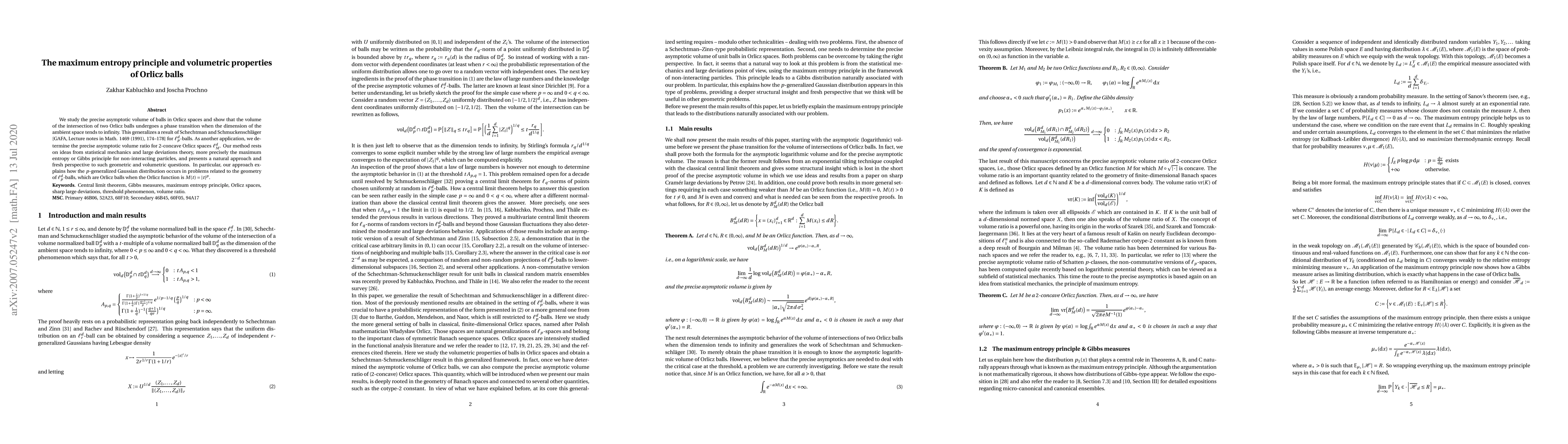 We study the precise asymptotic volume of balls in Orlicz spaces and show that the volume of the intersection of two Orlicz balls undergoes a phase transition when the dimension of the ambient space tends to infinity. This generalizes a result of Schechtman and Schmuckenschl\"ager [GAFA, Lecture notes in Math. 1469 (1991), 174--178] for $\ell_p^d$-balls. As another application, we determine the precise asymptotic volume ratio for $2$-concave Orlicz spaces $\ell_M^d$. Our method rests on ideas from statistical mechanics and large deviations theory, more precisely the maximum entropy or Gibbs principle for non-interacting particles, and presents a natural approach and fresh perspective to such geometric and volumetric questions. In particular, our approach explains how the $p$-generalized Gaussian distribution occurs in problems related to the geometry of $\ell_p^d$-balls, which are Orlicz balls when the Orlicz function is $M(t) = |t|^p$.