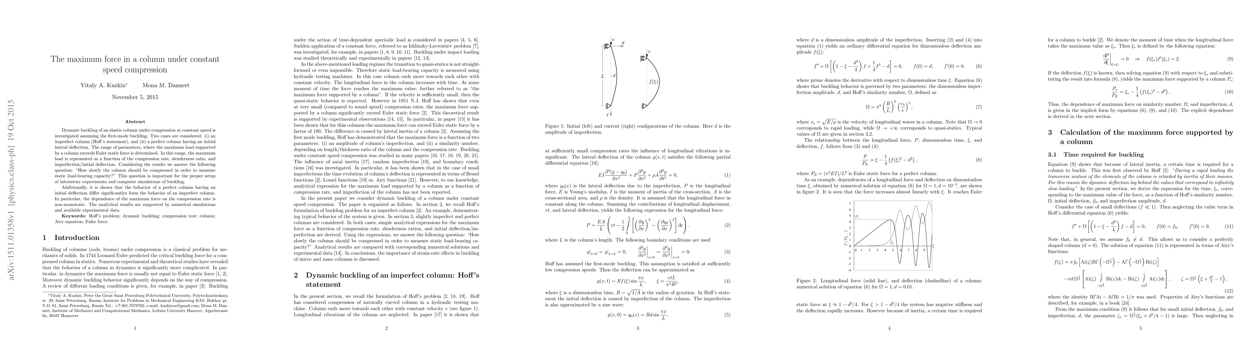 Dynamic buckling of an elastic column under compression at constant speed is investigated assuming the first-mode buckling. Two cases are considered: (i) an imperfect column (Hoff's statement), and (ii) a perfect column having an initial lateral deflection. The range of parameters, where the maximum load supported by a column exceeds Euler static force is determined. In this range, the maximum load is represented as a function of the compression rate, slenderness ratio, and imperfection/initial deflection. Considering the results we answer the following question: "How slowly the column should be compressed in order to measure static load-bearing capacity?" This question is important for the proper setup of laboratory experiments and computer simulations of buckling. Additionally, it is shown that the behavior of a perfect column having an initial deflection differ significantlys form the behavior of an imperfect column. In particular, the dependence of the maximum force on the compression rate is non-monotonic. The analytical results are supported by numerical simulations and available experimental data.