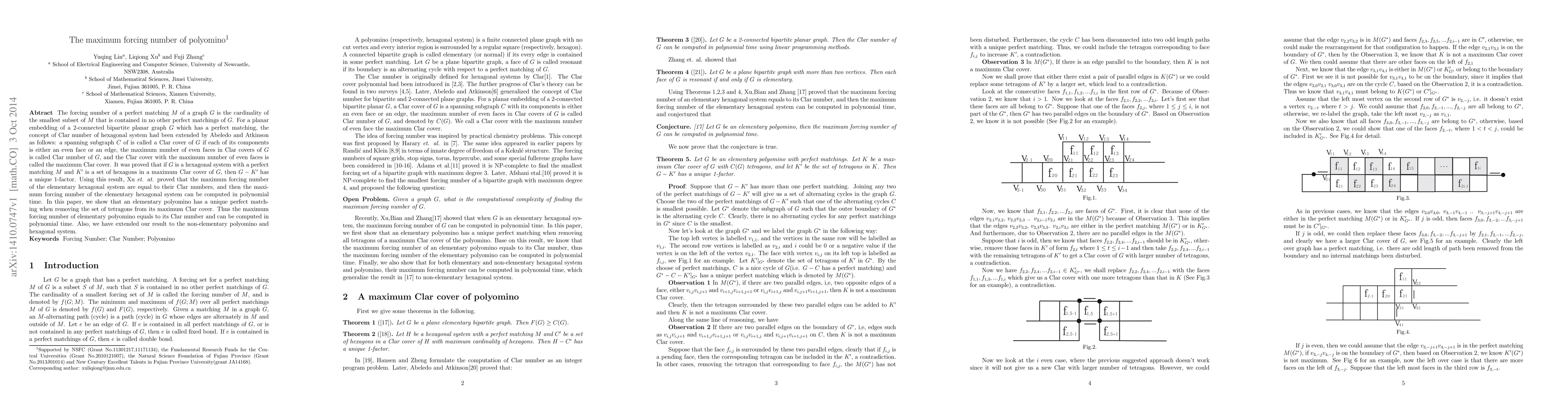The forcing number of a perfect matching $M$ of a graph $G$ is the cardinality of the smallest subset of $M$ that is contained in no other perfect matchings of $G$. For a planar embedding of a 2-connected bipartite planar graph $G$ which has a perfect matching, the concept of Clar number of hexagonal system had been extended by Abeledo and Atkinson as follows: a spanning subgraph $C$ of is called a Clar cover of $G$ if each of its components is either an even face or an edge, the maximum number of even faces in Clar covers of $G$ is called Clar number of $G$, and the Clar cover with the maximum number of even faces is called the maximum Clar cover. It was proved that if $G$ is a hexagonal system with a perfect matching $M$ and $K'$ is a set of hexagons in a maximum Clar cover of $G$, then $G-K'$ has a unique 1-factor. Using this result, Xu {\it et. at.} proved that the maximum forcing number of the elementary hexagonal system are equal to their Clar numbers, and then the maximum forcing number of the elementary hexagonal system can be computed in polynomial time. In this paper, we show that an elementary polyomino has a unique perfect matching when removing the set of tetragons from its maximum Clar cover. Thus the maximum forcing number of elementary polyomino equals to its Clar number and can be computed in polynomial time. Also, we have extended our result to the non-elementary polyomino and hexagonal system.
