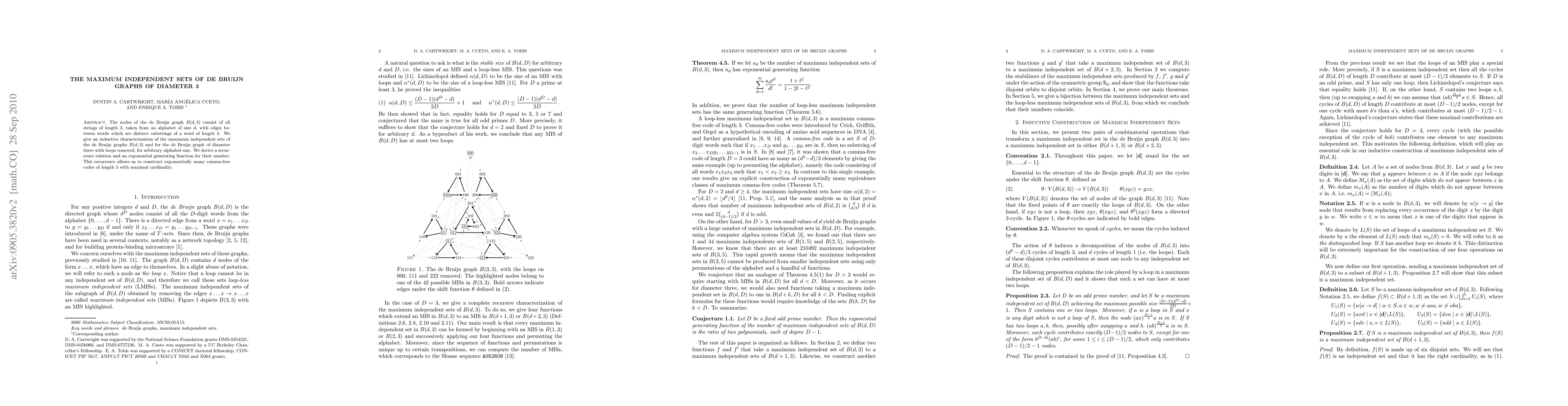 The nodes of the de Bruijn graph B(d,3) consist of all strings of length 3, taken from an alphabet of size d, with edges between words which are distinct substrings of a word of length 4. We give an inductive characterization of the maximum independent sets of the de Bruijn graphs B(d,3) and for the de Bruijn graph of diameter three with loops removed, for arbitrary alphabet size. We derive a recurrence relation and an exponential generating function for their number. This recurrence allows us to construct exponentially many comma-free codes of length 3 with maximal cardinality.