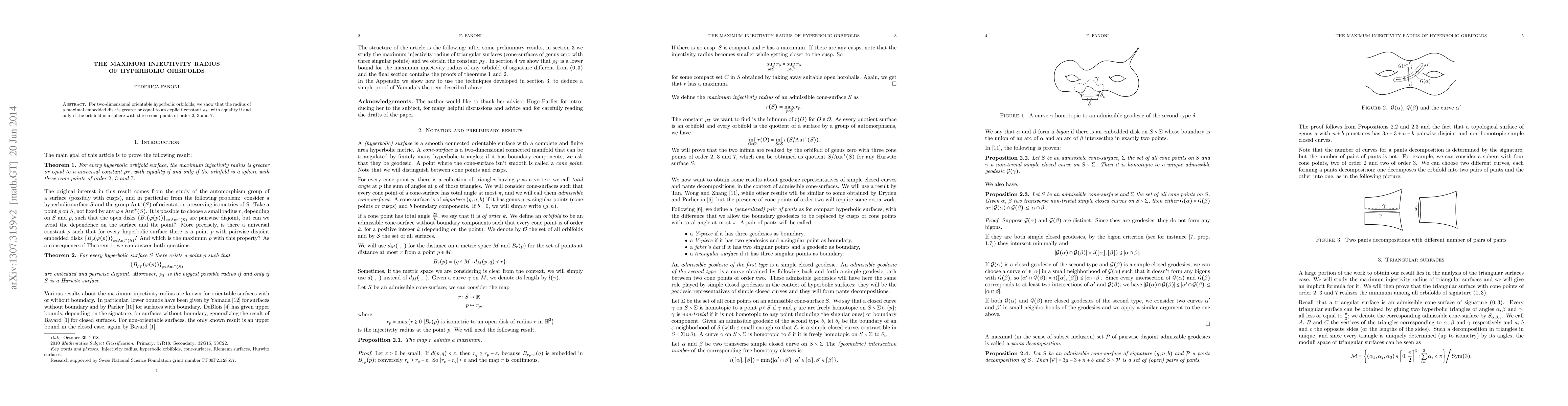 For two-dimensional orientable hyperbolic orbifolds, we show that the radius of a maximal embedded disk is greater or equal to an explicit constant \rho_T, with equality if and only if the orbifold is a sphere with three cone points of order 2, 3 and 7.