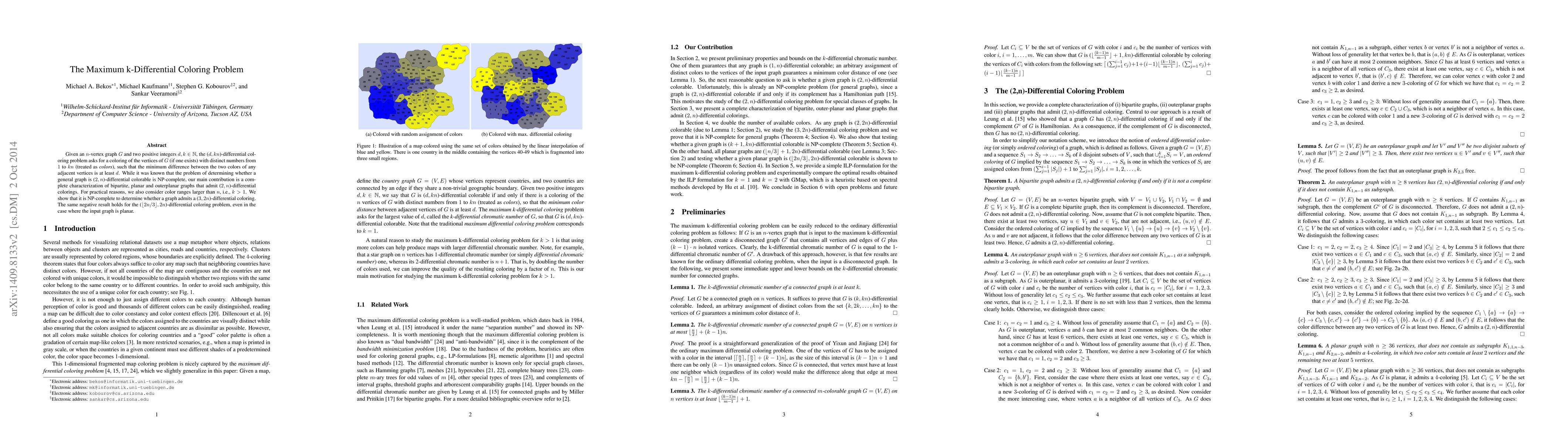 Given an $n$-vertex graph $G$ and two positive integers $d,k \in \mathbb{N}$, the ($d,kn$)-differential coloring problem asks for a coloring of the vertices of $G$ (if one exists) with distinct numbers from 1 to $kn$ (treated as \emph{colors}), such that the minimum difference between the two colors of any adjacent vertices is at least $d$. While it was known that the problem of determining whether a general graph is ($2,n$)-differential colorable is NP-complete, our main contribution is a complete characterization of bipartite, planar and outerplanar graphs that admit ($2,kn$)-differential colorings. For practical reasons, we consider also color ranges larger than $n$, i.e., $k > 1$. We show that it is NP-complete to determine whether a graph admits a ($3,2n$)-differential coloring. The same negative result holds for the ($\lfloor 2n/3 \rfloor, 2n$-differential coloring problem, even in the case where the input graph is planar.