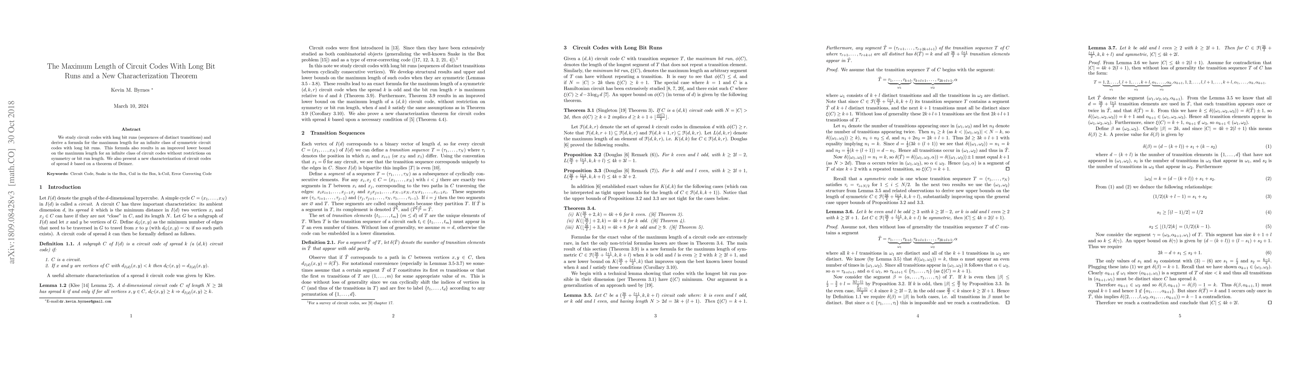 The study also introduces a characterization theorem based on Deimer's work, offering insights into circuit codes of spread k and their properties.