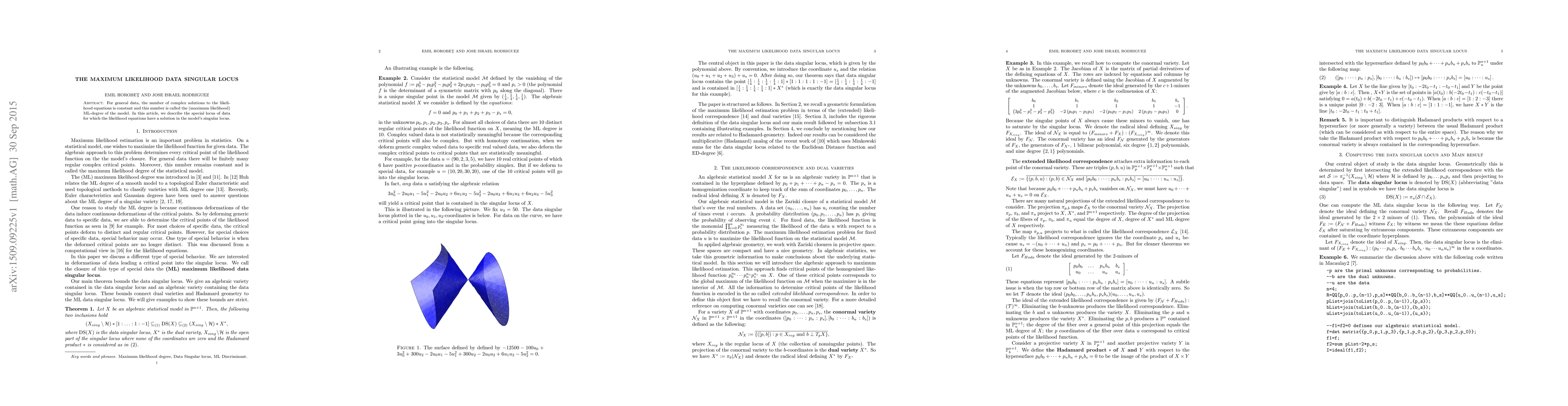 This paper investigates the maximum likelihood (ML) degree of a model, which is the constant number of complex solutions to the likelihood equations for general data. It focuses on identifying the special data locus where the likelihood equations intersect the model's singular locus.